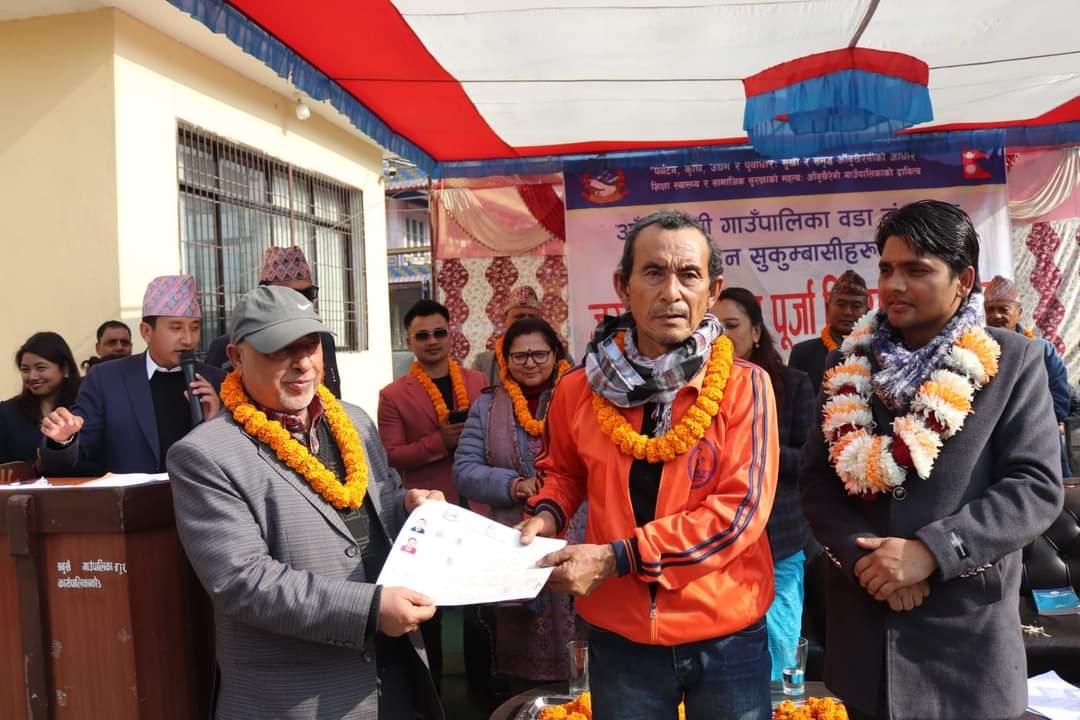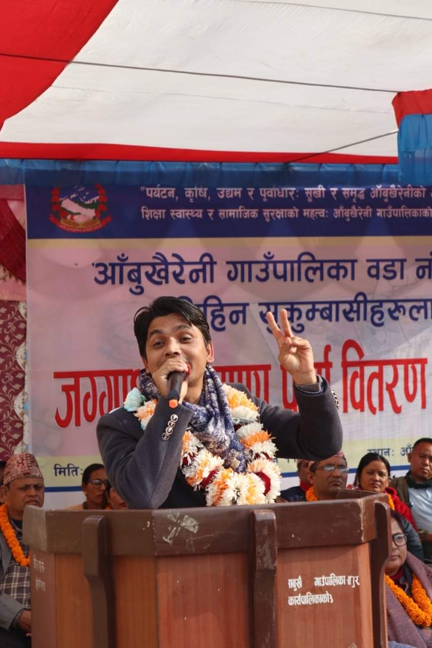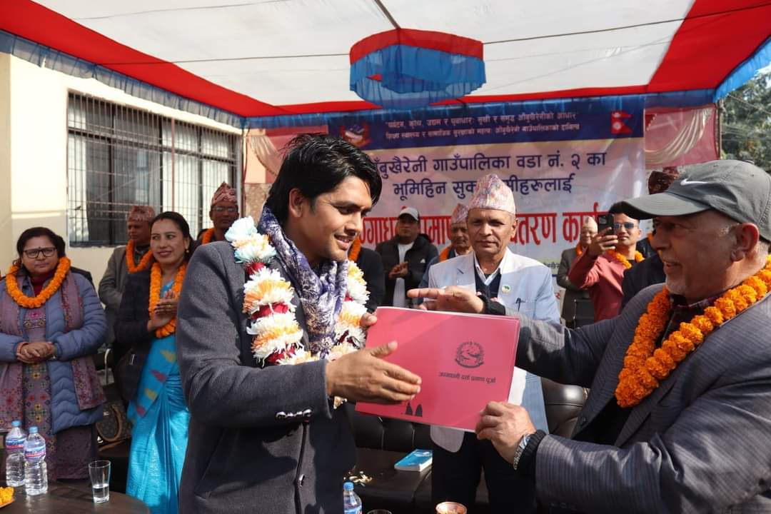 आँबुखैरेनी गाउँपालिकाका अध्यक्ष शुक्र चुमानले जनता माझ भोट माग्दाका दिन देखि आफुले चुनाव जिते सुकुम्बासीलाई लालपूर्जा बाँड्छु भनेर वाचा गरे बमोजिम यो बाचा आज आएर पूरा भएको बताए । करिब दुई वर्षअघि स्थानीय तह निर्वाचनमा उम्मेद्वार हुँदा अध्यक्ष चुमानले नागरिक सामु सुकुम्बासी लाई पूर्जा उपलब्ध गराउने वाचा गरेका थिए। पालिका अध्य चुमानले क्रमिक रुपमा अरु वडाहरुको प्रक्रिया पूरा भएपछि पूर्जा वितरण गरिने प्रतिबद्धता गरेका थिए ।