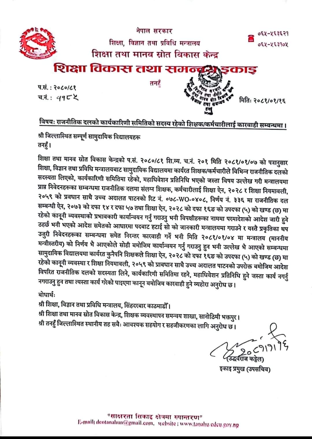 सामुदायिक विद्यालयमा कार्यरत कुनै पनि शिक्षकले शिक्षा ऐन २०२८ को दफा १६ ङ को उपदफा ५ को खण्ड ६ मा रहेको कानुनी व्यवस्था र शिक्षा नियमावली २०५९ को प्रावधान साथै उच्च अदालत पाटनको उपरोक्त बमोजिम आदेश विपरीत राजनीतिकदलको सदस्यता लिने कार्यकारिणी समितिमा रहने , महाधिवेशन प्रतिनिधि हुने जस्ता कार्य नगर्नु नगराउनु हुन तथा त्यस्ता कार्य गरेको पाइएमा कानुन बमोजिम कारबाही हुने व्यहोरा समेत इकाई प्रमुख कटेलद्वारा हस्ताक्षरित पत्रमा उल्लेख छ। जसको बोधार्थ शिक्षा विज्ञान तथा प्रविधि मन्त्रालय सिंहदरबार ,काठमाडौँ , शिक्षा मानव तथा स्रोत विकास केन्द्र शिक्षा व्यवस्थापन समन्वय शाखा , सानोठिमी भक्तपुर र तनहुँ जिल्ला स्थित स्थानीय तहका सबैलाई आवश्यक सहयोग र सहजीकरणका लागि पनि इकाइले अनुरोध गरेको छ।
