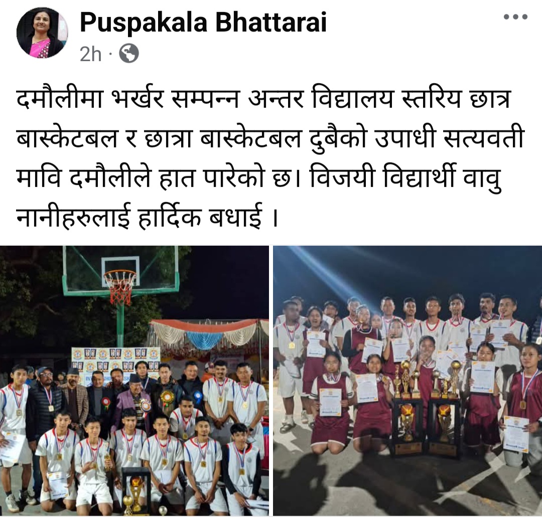 यसै बिच आफ्नो विद्यालयका विद्यार्थीहरु प्रथम भएपछि सामाजिक संञ्जाल फेसबुक मार्फत सत्यवती माविका प्रधानाध्याप पुष्पकला भट्टराईले फोटो पोष्ट गर्दै बधाई दिएकी छिन् ।
