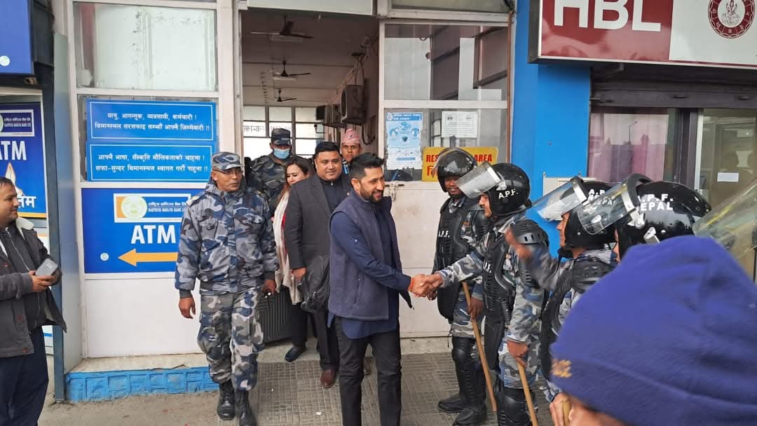 यसै बिच लामिछानेले प्रफूल्तित मुद्रामा सुरक्षामा खटिएका सशस्त्र प्रहरीका जवानसँग हात मिलाएका । तस्विरमा उनले हात मिलाएको प्रष्ट देख्न सकिन्छ।