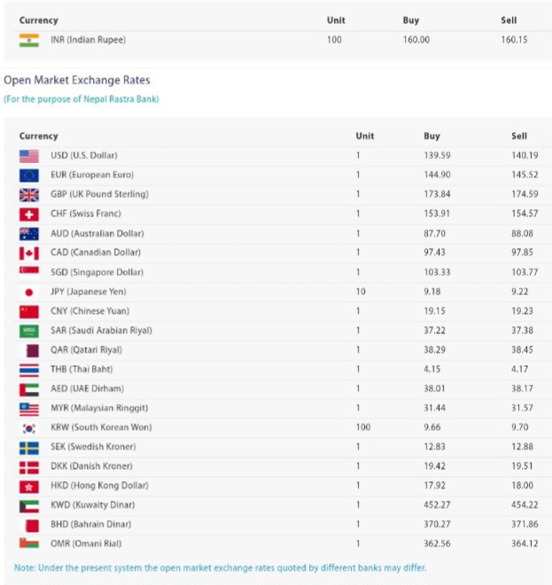नेपाल राष्ट्र बैंकको आजको लागि विदेशी मुद्राको विनिमय दर तोकेको छ । जस अनुसार आजको विनिमय दर यस प्रकार रहेको छ :