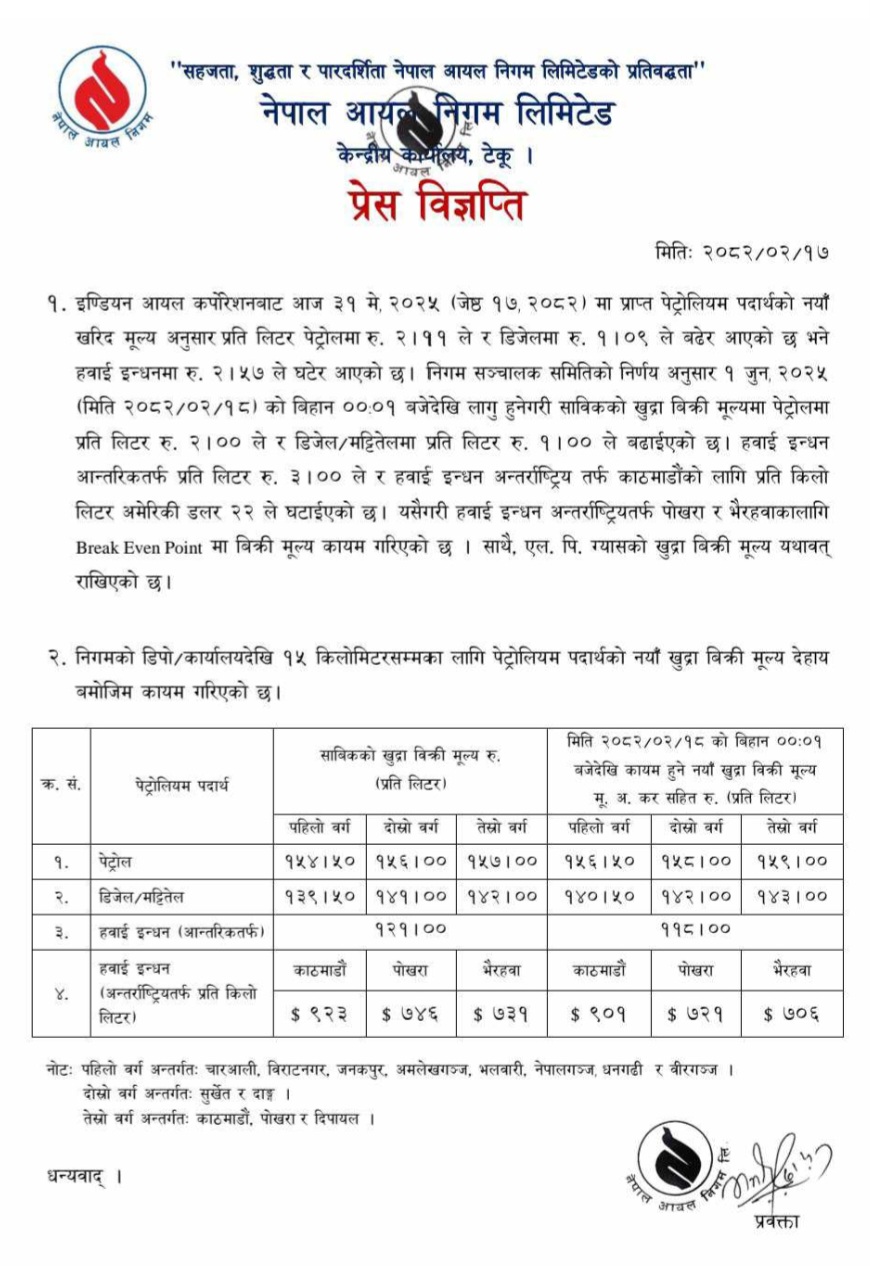 प्रहार समाचार । काठमाडौँ, १७ जेठ २०८१ शनिवार । नेपाल आयल निगमले इन्धनको मूल्य समायोजन गर्दै पेट्रोल र डिजेल/मट्टितेलको खुद्रा बिक्री मूल्यमा भारी वृद्धि गरेको छ भने हवाई इन्धनको मूल्य घटाएको छ। निगमको निर्णयले उपभोक्ताको दैनिक खर्च बढाउने देखिए पनि हवाई सेवा प्रयोगकर्ताका लागि केही राहत प्रदान गर्ने अपेक्षा गरिएको छ।