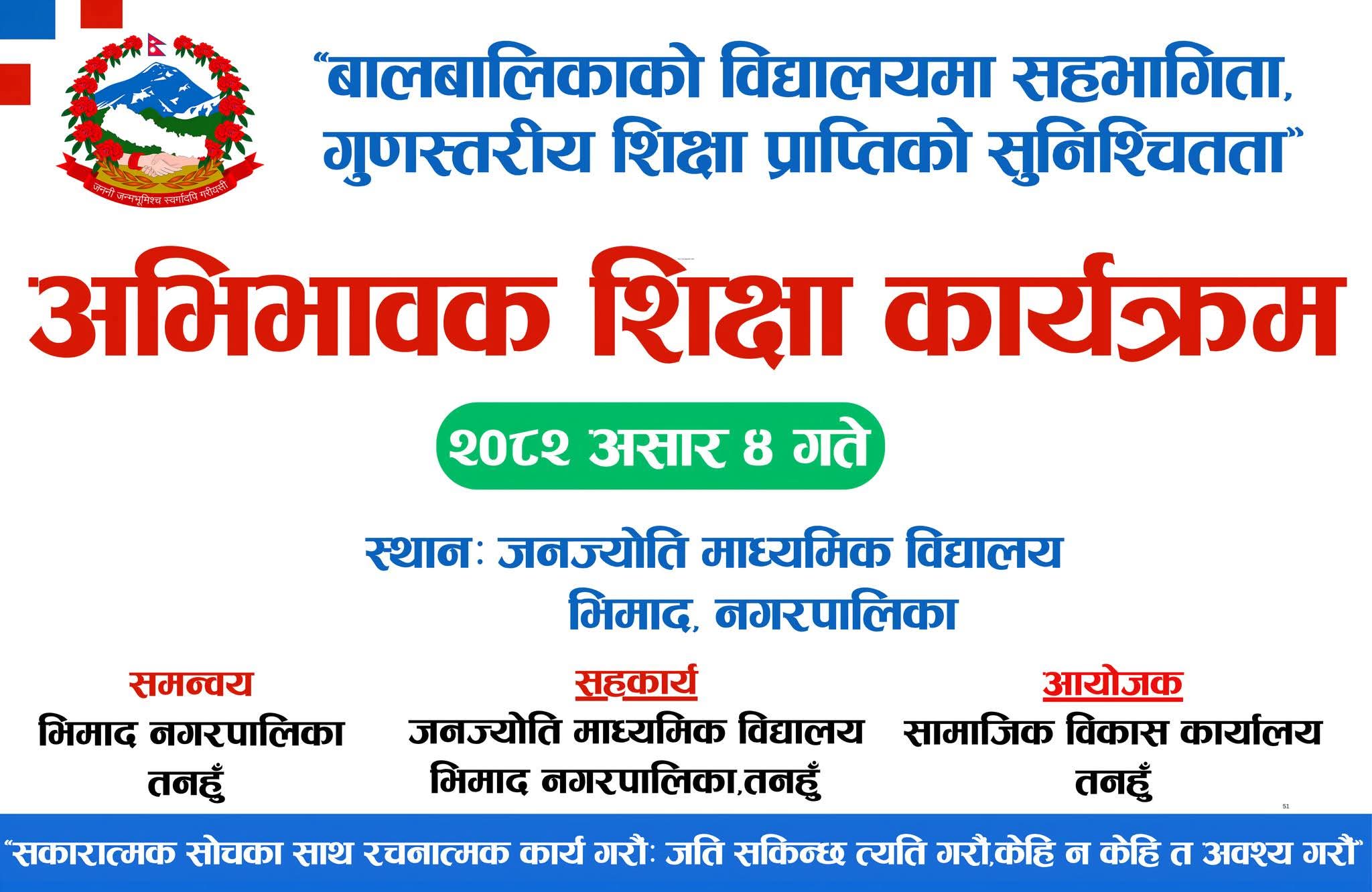 तनहुँ, ५ असार २०८२ बिहीवार । ‘बालबालिकाको विद्यालयमा सहभागिता, गुणस्तरीय शिक्षा प्राप्तिको सुनिश्चितता’ भन्ने मूल नारासहितको अभिभावक शिक्षा कार्यक्रम तनहुँको भिमाद नगरपालिकामा सम्पन्न भएको छ। जनज्योति माध्यमिक विद्यालय भिमादमा आयोजित कार्यक्रममा विद्यार्थी, अभिभावक, विद्यालयका प्रधानाध्यापक तथा शिक्षकहरूको उपस्थिति रहेको थियो।