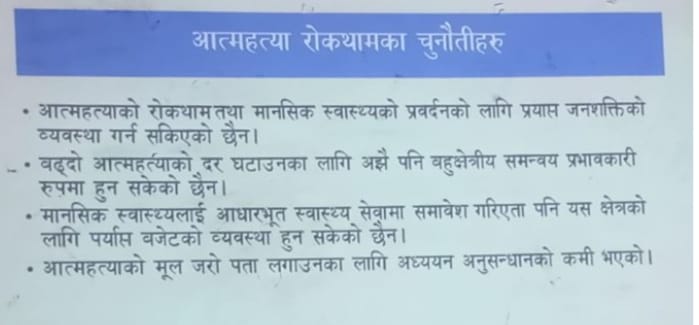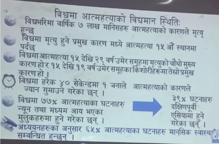 कोशिश नेपालका लमजुङ–गोरखा संयोजक महेन्द्र आचार्यका अनुसार आत्महत्याको विद्यमान अवस्था, कारण, जोखिम तथा जोखिममा रहेका व्यक्तिका संकेतबारे जानकारी गराइएको थियो। उनले नेपाल प्रहरीको तथ्यांक उद्धृत गर्दै आर्थिक वर्ष २०८०/८१ मा देशभर ७ हजार २ सय २३ जनाले आत्महत्या गरेको र गण्डकी प्रदेशमा मात्र ४ सय ७७ जनाले आत्महत्या गरेर ज्यान गुमाएको बताए।