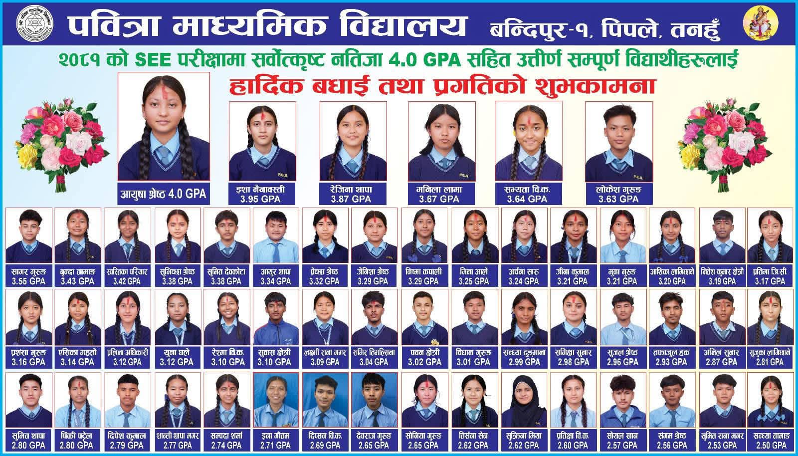 विद्यालय परिवारले एसईई परीक्षामा सफल सम्पूर्ण विद्यार्थीहरूलाई सम्मान सहित बधाई दिएर उज्ज्वल भविष्यको कामना व गरेको छ।