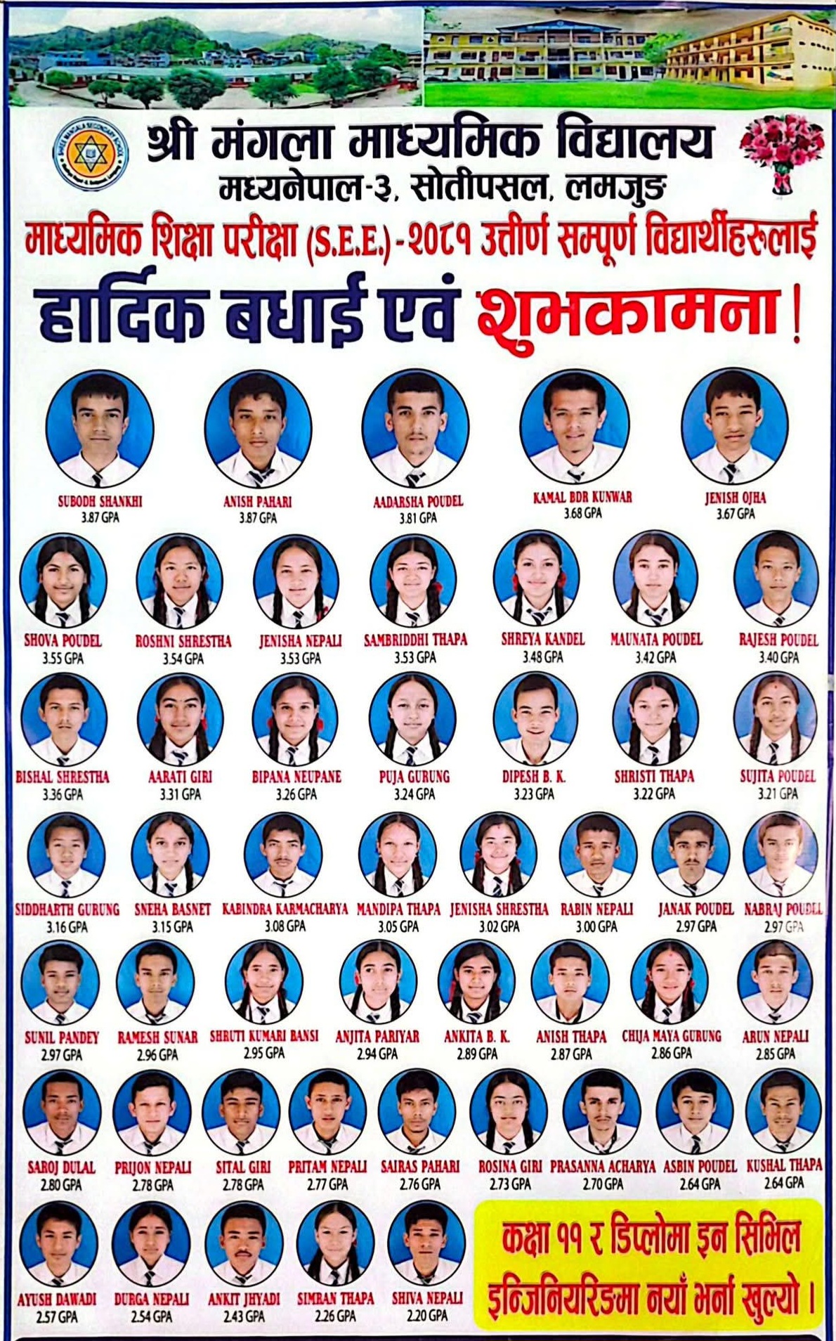 विद्यालयका प्रधानाध्यापक विष्णुहरी बास्तोलाले मङ्गला बाट उत्तीर्ण विद्यार्थीह देशका विभिन्न ठाउँमा उत्कृष्ट योगदान दिइरहेको स्मरण गर्दै यसपटकको एसईई परीक्षामा पनि विद्यार्थीहरूले सोचे अनुरूप नतिजा नल्याएपनि आगामी दिनमा सुदूर ग्रामीण क्षेत्रमा पनि गुणस्तरीय शिक्षा सम्भव छ र गरे हुन्छ भन्ने कुरा प्रमाणीत गरिने बताए । प्रअ बास्तोलाले अबको यात्रामा विद्यालयले रोजगार मूलक, प्रविधिमैत्री र सिर्जनात्मक शिक्षातर्फ केन्द्रित हुने प्रतिबद्धता व्यक्त गरे ।