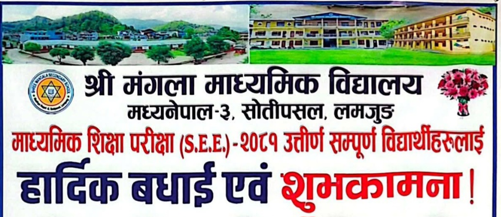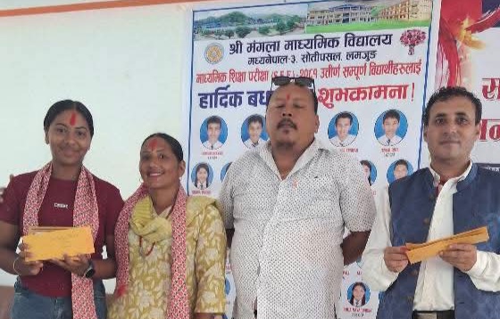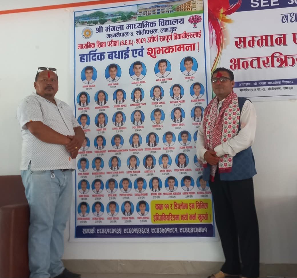 प्रहार समाचार । लमजुङ, १८ असार २०८२ बुधवार । लमजुङको मध्यनेपाल नगरपालिका–३ स्थित मंगला माध्यमिक विद्यालय, सोतीपसलले एसईई २०८१ मा उत्कृष्ट प्रदर्शन गर्ने विद्यार्थीहरूलाई बधाई तथा सम्मान गर्दै शैक्षिक अन्तर्क्रिया कार्यक्रम सम्पन्न गरेको छ।