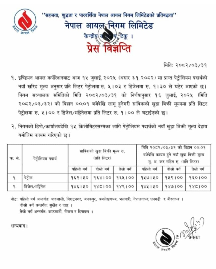 निगम सञ्चालक समितिको मंगलबार बसेको बैठकले पेट्रोलमा प्रतिलिटर ५ रुपैयाँ र डिजेल तथा मट्टितेलमा १ रुपैयाँ घटाउने निर्णय गरेको हो । यो निर्णय गएराति १२ बजेदेखि लागू गरिएको निगमले जनाएको छ ।