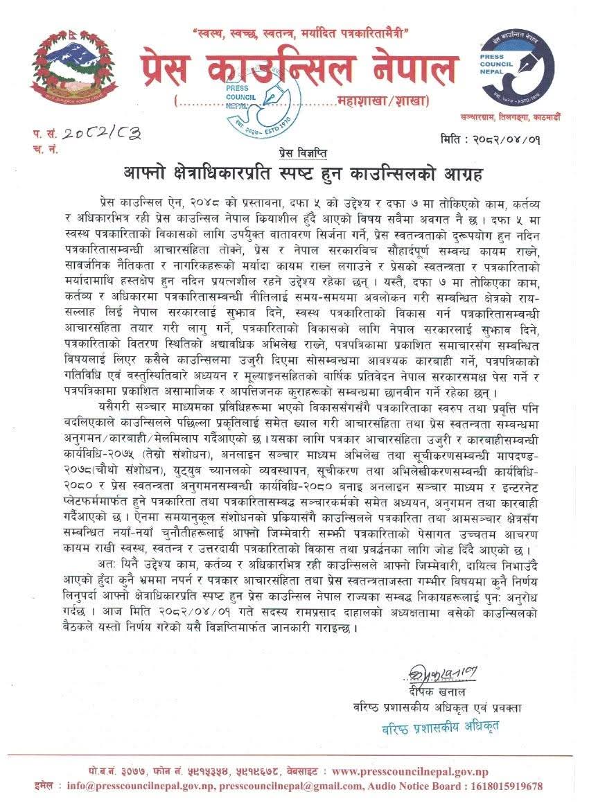 प्रेस काउन्सिल नेपाल ऐन, २०४८ अन्तर्गत दफा ५ र ७ मा उल्लेखित उद्देश्य र अधिकारभित्र रही काउन्सिलले पत्रकारिताको मर्यादा, प्रेस स्वतन्त्रता तथा सार्वजनिक नैतिकताको संरक्षणमा ध्यान दिँदै आएको विज्ञप्तिमा उल्लेख गरिएको छ। यस्तै पछिल्लो समय सञ्चार प्रविधिको विकाससँगै पत्रकारिताका स्वरूपमा आएको परिवर्तनअनुसार युट्युब, अनलाइनजस्ता माध्यमसमेत नियमन गर्ने कार्यविधि तयार गरी कार्यान्वयन भइरहेको जानकारी दिइएको छ।