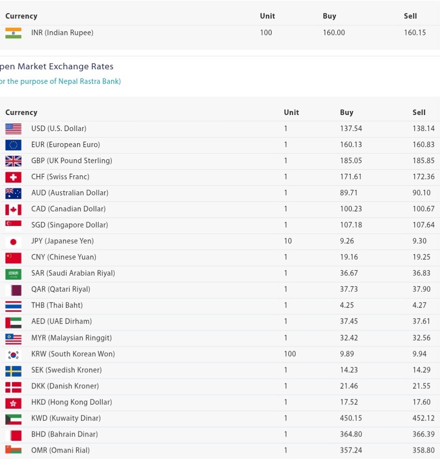 प्रहार समाचार । काठमाडौँ, ४ साउन २०८२ आइतवार । नेपाल राष्ट्र बैंकले आजको लागि विदेशी मुद्राको विनिमय दर निर्धारण गरेको छ। जस अनुसार विनिमय दर यसप्रकार रहेको छ।