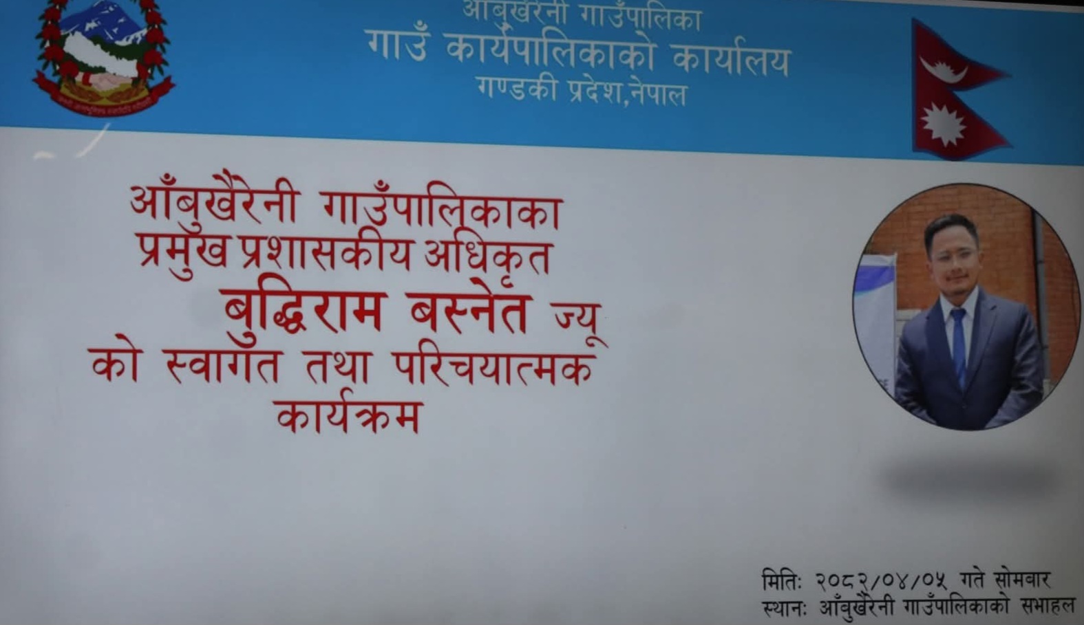 तनहुँ, ५ साउन २०८२ सोमवार । तनहुँको आँबुखैरेनी गाउँपालिकाको प्रमुख प्रशासकीय अधिकृतको जिम्मेवारी बुद्धिराम बस्नेतले संहालेका छन्। आज बस्नेतलाई पालिकाले स्वागत,अन्तरक्रिया तथा परिचयात्मक कार्यक्रम सम्पन्न गरेको छ ।