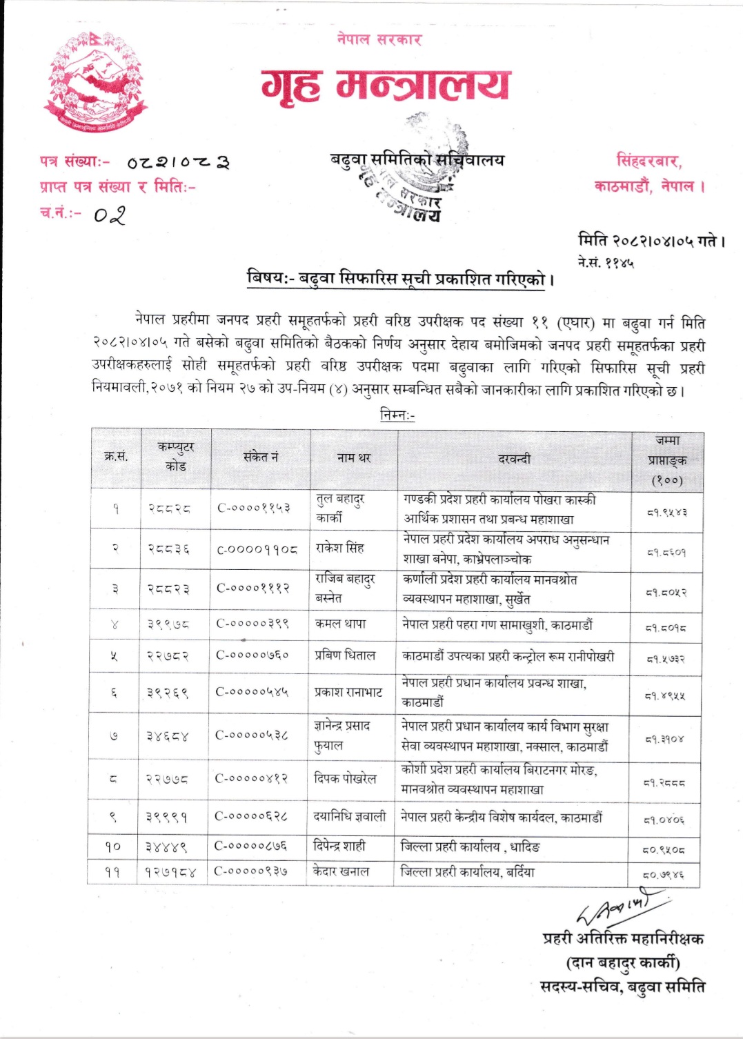 बढुवा सिफारिस सूचीको पहिलो नम्बरमा गण्डकी प्रदेश प्रहरी कार्यालय, पोखराको आर्थिक प्रशासन तथा प्रबन्ध महाशाखामा कार्यरत तुल बहादुर कार्की परेका छन्। सूचीमा कार्कीले ८१.९५४३ अंक प्राप्त गरेका छन्। दोस्रोमा बनेपा काभ्रेपलाञ्चोकस्थित अपराध अनुसन्धान शाखाका राकेश सिंह छन् भने तेस्रोमा कर्णाली प्रदेश प्रहरी कार्यालय सुर्खेतका राजिव बहादुर बस्नेत रहेका छन्।