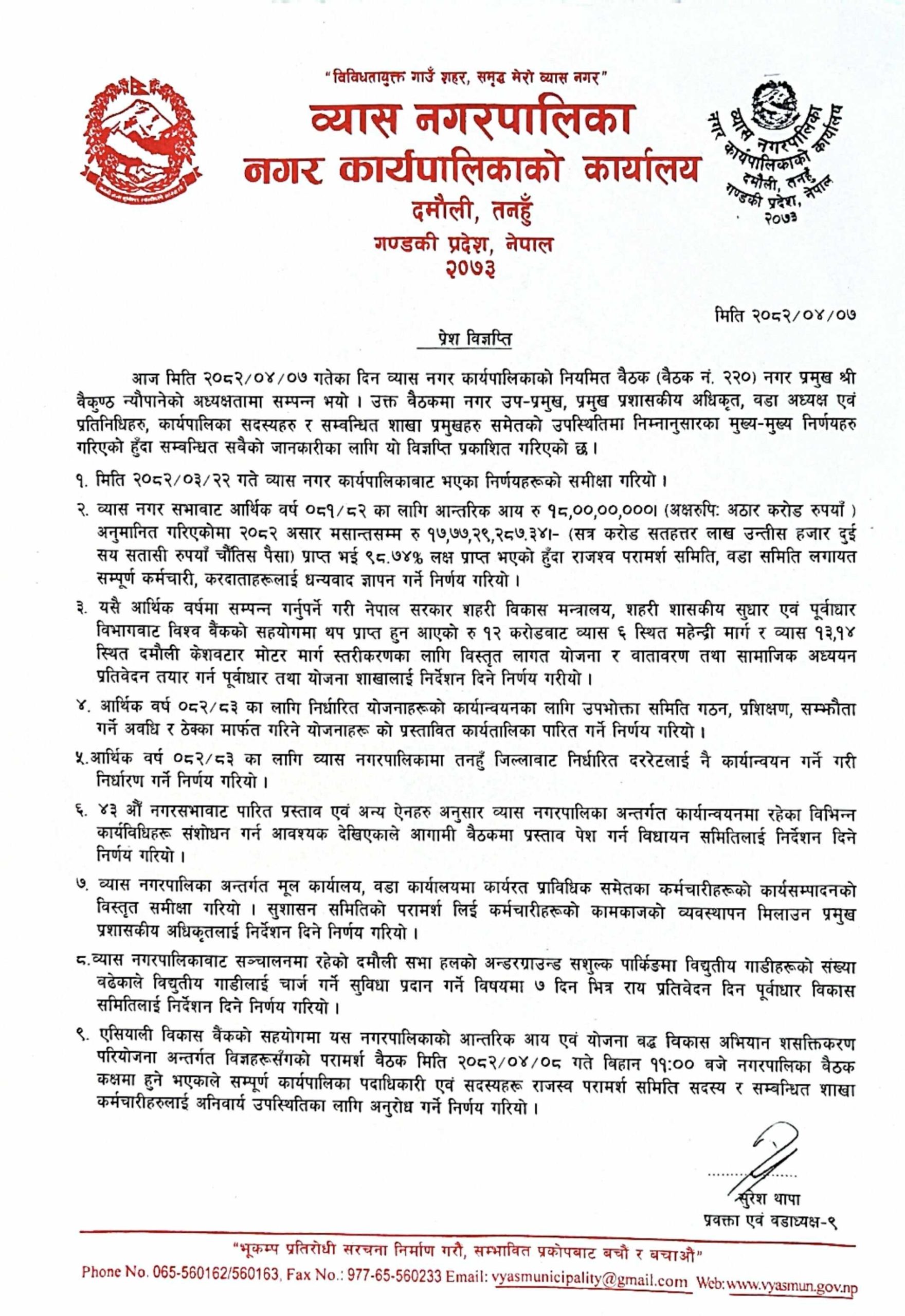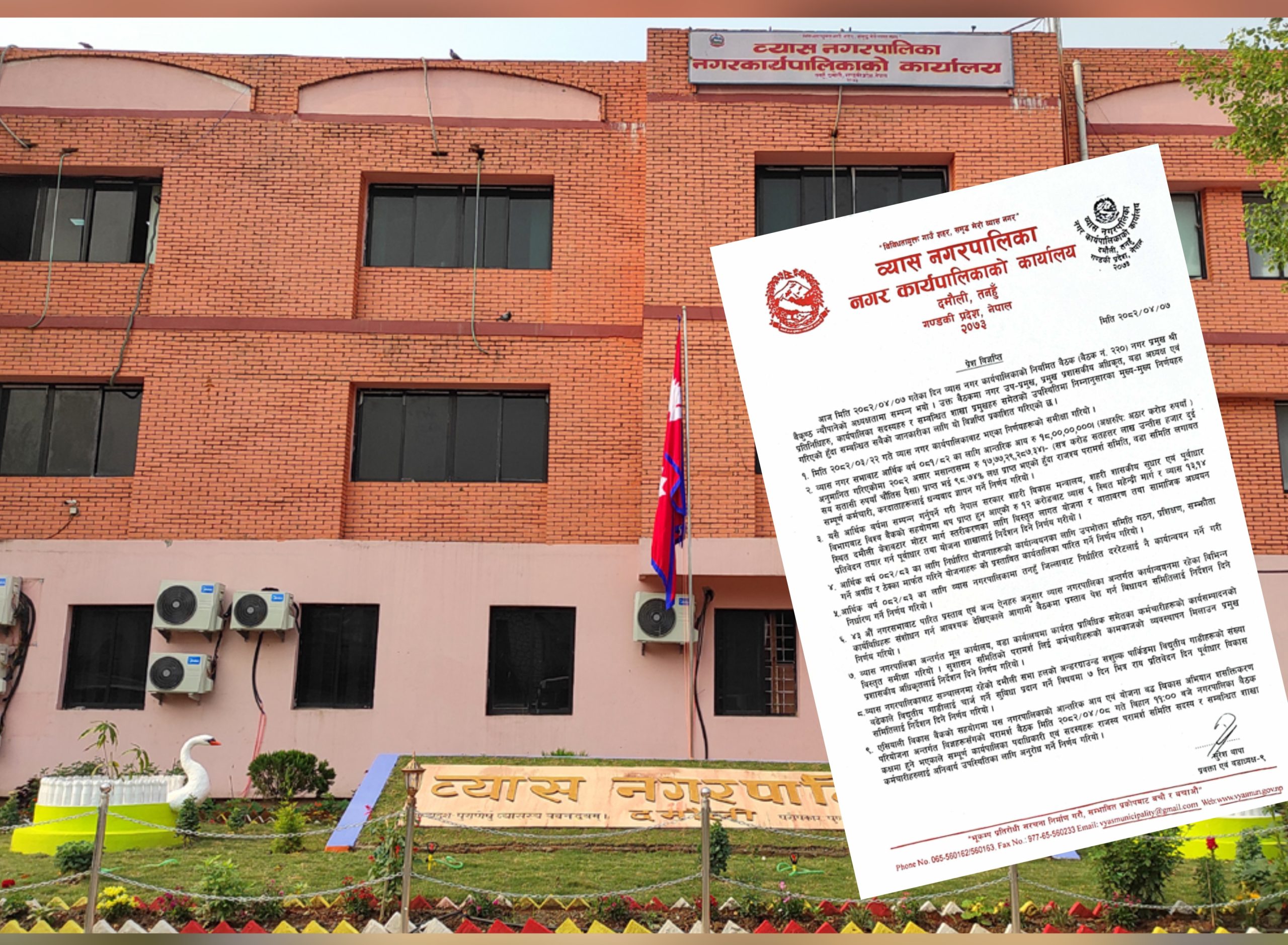 प्रहार समाचार । तनहुँ, ७ असार २०८२ बुधवार । तनहुँको व्यास नगरपालिकाले आर्थिक वर्ष ०८१/८२ का लागि तय गरेको र१८ करोड आन्तरिक आयमध्ये ९८.७४ प्रतिशत संकलन गर्न सफल भएको छ। नगर प्रमुख वैकुण्ठ न्यौपानेको अध्यक्षतामा बुधबार सम्पन्न नगर कार्यपालिकाको २२० औं बैठकले आन्तरिक राजस्व संकलनमा उल्लेखनीय प्रगति भएको भन्दै राजस्व परामर्श समिति, वडा समिति, कर्मचारी तथा करदाताहरूप्रति धन्यवाद ज्ञापन गरेको छ। बैठकले विकास योजनामा तीव्रता ल्याउने निर्णयसँगै विभिन्न महत्त्वपूर्ण विषयमा निर्देशन तथा निर्णयहरू गरेको छ।