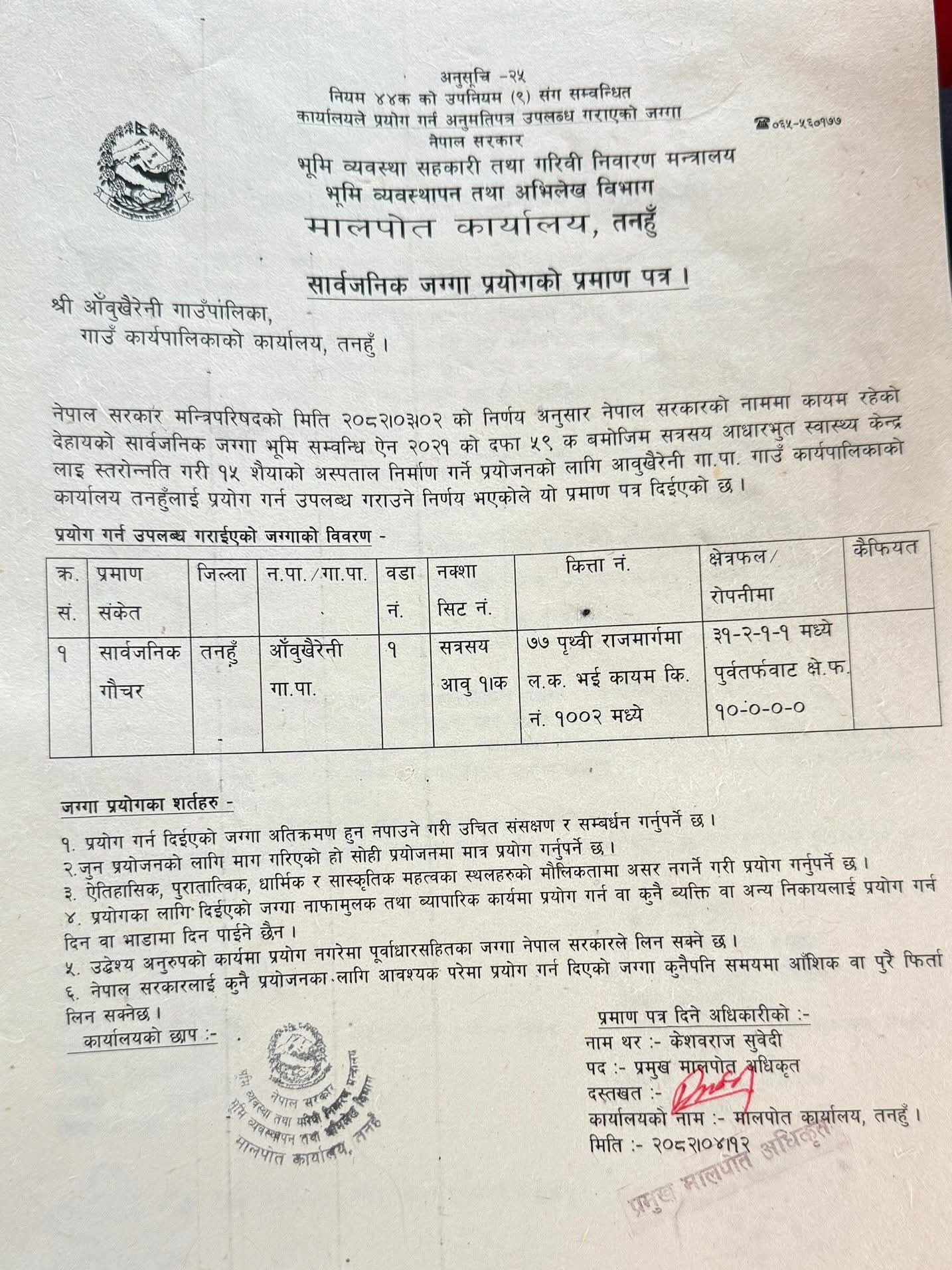 भूमि सम्बन्धी ऐन २०२१ को दफा ५९ (क) बमोजिम अस्पताल स्तरोन्नतिको उद्देश्यले सार्वजनिक जग्गा उपलब्ध गराइएको हो। मालपोत कार्यालय तनहुँबाट २०८२ साल साउन १२ गते जारी गरिएको प्रमाणपत्र अनुसार गाउँपालिका–१ स्थित पृथ्वीराजमार्ग नजिककै कित्ता नं. १००२ को ३१-२-१-१ भागअन्तर्गत रहेको सार्वजनिक गौचर जमीन अस्पताल निर्माणका लागि प्रयोग गर्न पाइनेछ।