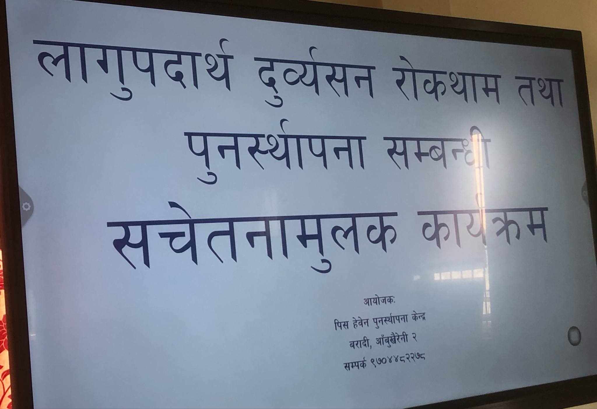 पिस हेवन पुनस्थापना केन्द्रका अध्यक्ष रविन्द्र श्रेष्ठले आबुखैरेनीमा समुदायस्तरमा सचेतनामूलक कार्यक्रमहरू विस्तार गर्ने बताएका छन्। ‘समाजमा व्यवहारिक सुधार ल्याउन पुनःस्थापनाको साथमा परिवार, छिमेक र समुदायको सहयोग आवश्यक छ।’-उनले जोड दिए। कार्यक्रमको सहजीकरण ईश्वर बास्तोलाले गरेका थिए।