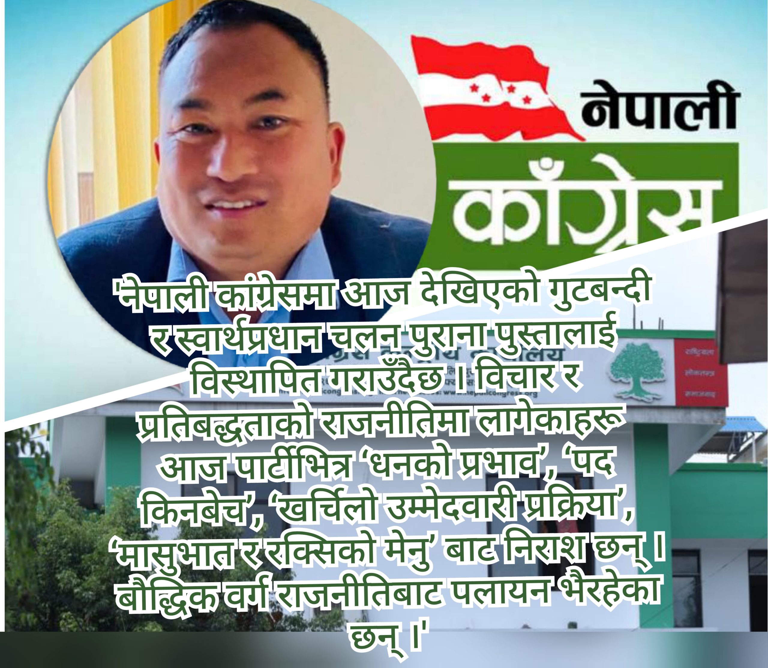 नेपाली कांग्रेसमा आज देखिएको गुटबन्दी र स्वार्थप्रधान चलन पुराना पुस्तालाई विस्थापित गराउँदैछ । विचार र प्रतिबद्धताको राजनीतिमा लागेकाहरू आज पार्टीभित्र ‘धनको प्रभाव’, ‘पद किनबेच’, ‘खर्चिलो उम्मेदवारी प्रक्रिया’, ‘मासुभात र रक्सिको मेनु’ बाट निराश छन् । बौद्धिक वर्ग राजनीतिबाट पलायन भैरहेका छन् । पार्टीको जरा सिँच्नेहरू, आस्थावान कार्यकर्ता, विचार बोकेका नेताहरूको कदर छैन । नेतृत्व आलोचना सहन चाहँदैन, न त वैचारिक छलफलमै रुचि राख्दछ ।