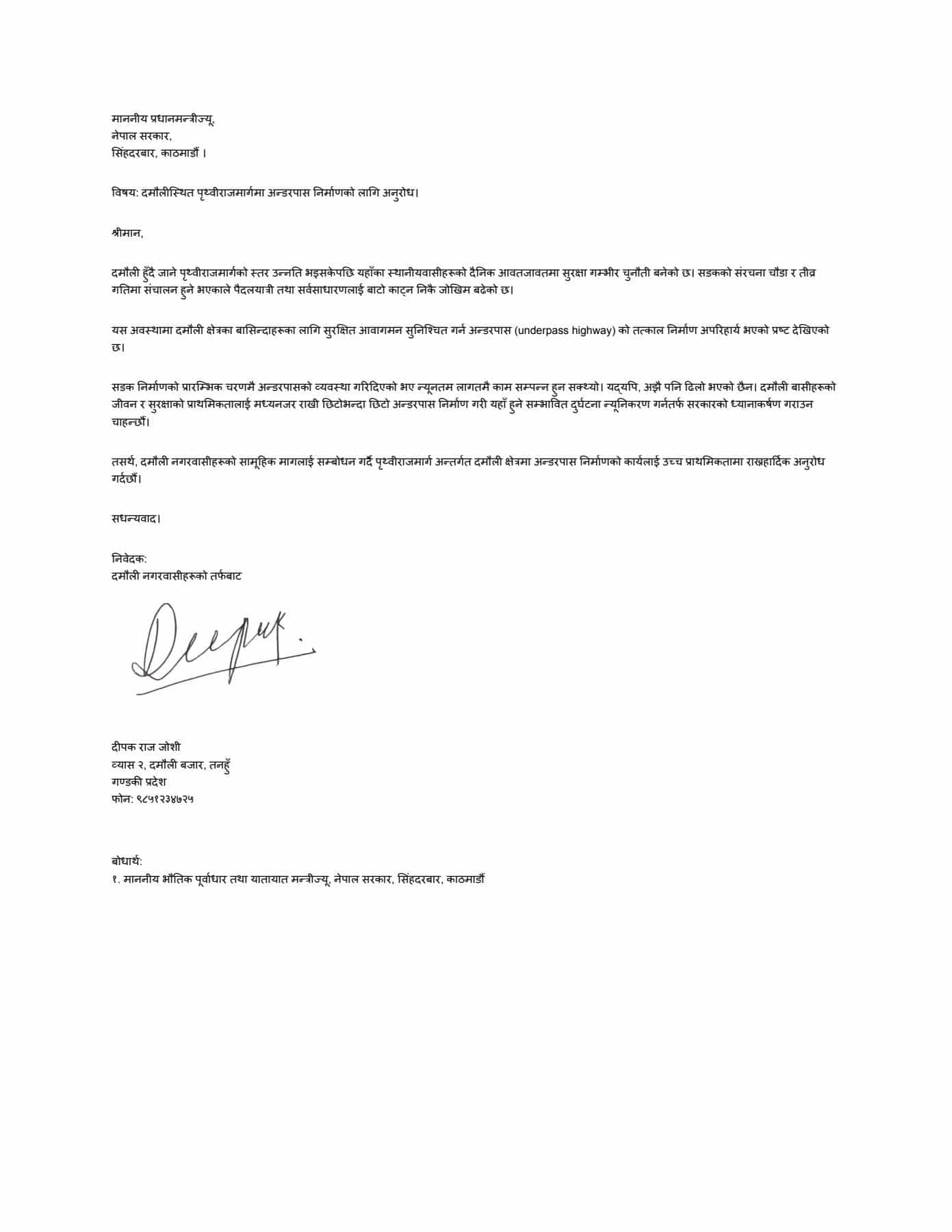 दमौलीवासीहरूको सामूहिक मागलाई सम्बोधन गर्न प्रधानमन्त्रीसँगै भौतिक पूर्वाधार तथा यातायात मन्त्रीलाई समेत बोधार्थ पठाइएको छ। स्थानीयवासीले अन्डरपास निर्माणलाई उच्च प्राथमिकतामा राखी कार्यान्वयन नगरे गम्भीर दुर्घटनाको जोखिम बढ्ने चेतावनी दिंदै जनताको जीवन र सुरक्षालाई प्राथमिकतामा राख्न सरकारसँग जोडदार आग्रह गरेका छन्।