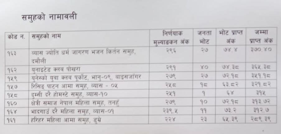 हिंजो सम्पन्न फाइनलमा आठ समूह प्रतिस्पर्धामा उत्रिएका थिए। युनाइटेड क्लब पोखराले द्वितीय भए पनि उनीहरुले तत्कालै निर्णायकतर्फ औंला ठडाउँदै “निर्णय अन्यायपूर्ण छ, ‘भजन’लाई तीज गीतको नाममा जिताइयो” भन्दै मञ्चमै आक्रोश पोखेका थिए। प्रतियोगितामा पुर्कोट युनाइटेड तृतीय र ऋषिङ पाटन आमा समूह सान्त्वना भएको निर्णयकले घोषणा गरेका थिए ।