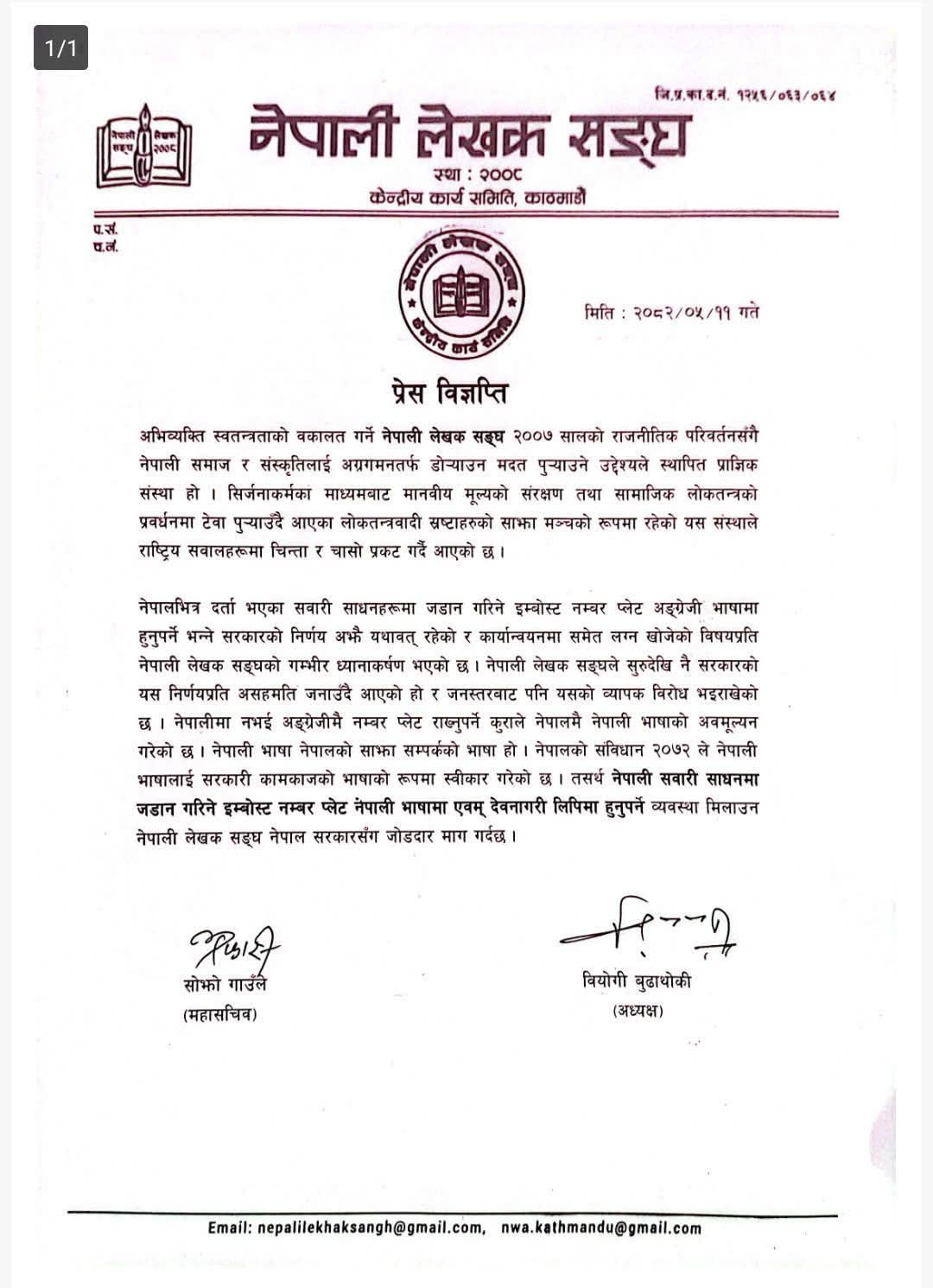 लेखक सङ्घका अध्यक्ष वियोगी बुढाथोकी र महासचिव सोझो गाउँलेले संयुक्त रूपमा जारी गरेको विज्ञप्तिमा “नेपाली भाषामा नभई अंग्रेजी भाषामै नम्बर प्लेट राख्नुपर्ने निर्णयले नेपाली भाषाको अवमूल्यन गरेको छ” भन्दै तत्काल सरकारले आफ्नो नीति सच्याउन माग गरिएको छ। सङ्घले यसअघि पनि यस विषयमा असहमति जनाएको थियो तर सरकार अडानमा टस्ने नसकेको भन्दै चिन्ता प्रकट गरेको छ।