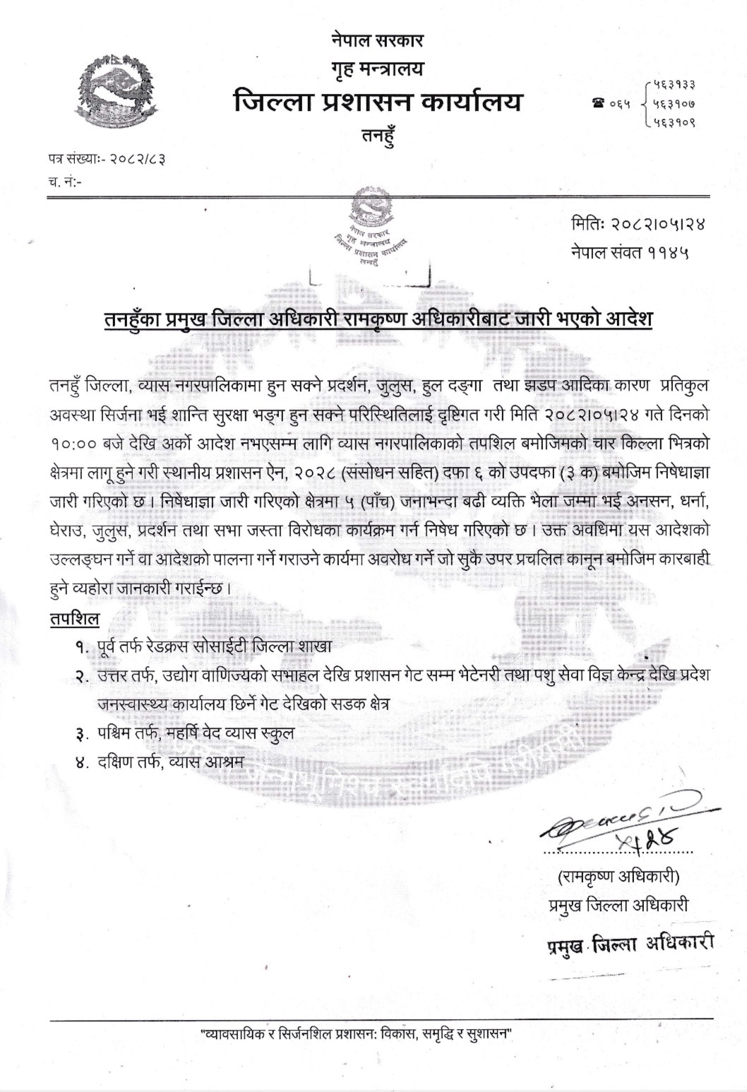 प्रहार समाचार । तनहुँ, २४ भदौ २०८२ मङ्गलवार । जिल्ला प्रशासन कार्यालय तनहुँले व्यास नगरपालिकाको चार किल्लाभित्र प्रदर्शन, जुलुस, धर्ना, सभा तथा अन्य विरोधका कार्यक्रम गर्न निषेधाज्ञा जारी गरेको छ। प्रमुख जिल्ला अधिकारी रामकृष्ण अधिकारीले आज बिहान १० बजेदेखि अर्को आदेश नभएसम्म लागू हुने गरी स्थानीय प्रशासन ऐन, २०२८ को दफा ६ को उपदफा (३ क) अनुसार निषेधाज्ञा जारी गरिएको जानकारी गराएका छन्।