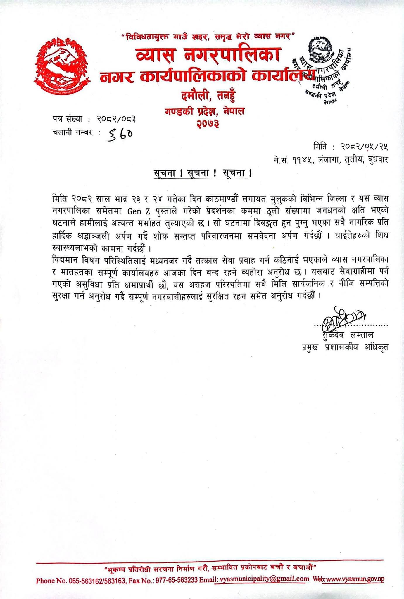 प्रहार समाचार । तनहुँ, २५ भदौ २०८२ बुधवार । तनहुँको व्यास नगरपालिकाले आज एक सार्वजनिक सूचनामार्फत भदौ २३ र २४ गते मुलुकभर Gen Z पुस्ताले गरेको प्रदर्शनका क्रममा भएको जनधनको क्षतिप्रति गहिरो दुःख व्यक्त गरेको छ। घटनामा ज्यान गुमाउने नागरिकप्रति श्रद्धाञ्जली अर्पण गर्दै नगरपालिकाले शोक सन्तप्त परिवारप्रति समवेदना प्रकट गरेको छ। साथै, घाइतेहरुको शीघ्र स्वास्थ्यलाभको कामनासमेत गरिएको छ।