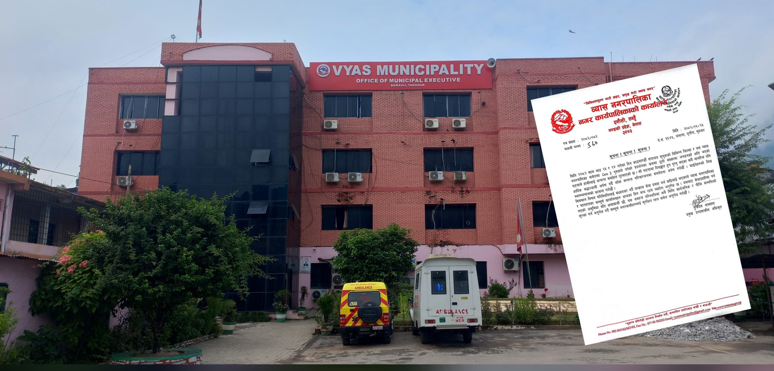 घटनापछि उत्पन्न भएको असहज परिस्थितिका कारण व्यास नगरपालिका तथा मातहतका सम्पूर्ण कार्यालयहरू आज (भदौ २५ गते) का लागि बन्द गरिएको सूचनामा उल्लेख छ। नगरपालिका प्रशासनले तत्काल सेवा प्रवाहमा कठिनाई भएको स्पष्ट पार्दै सेवाग्राहीमा पर्न सक्ने असुविधाप्रति क्षमायाचना गरेको छ ।