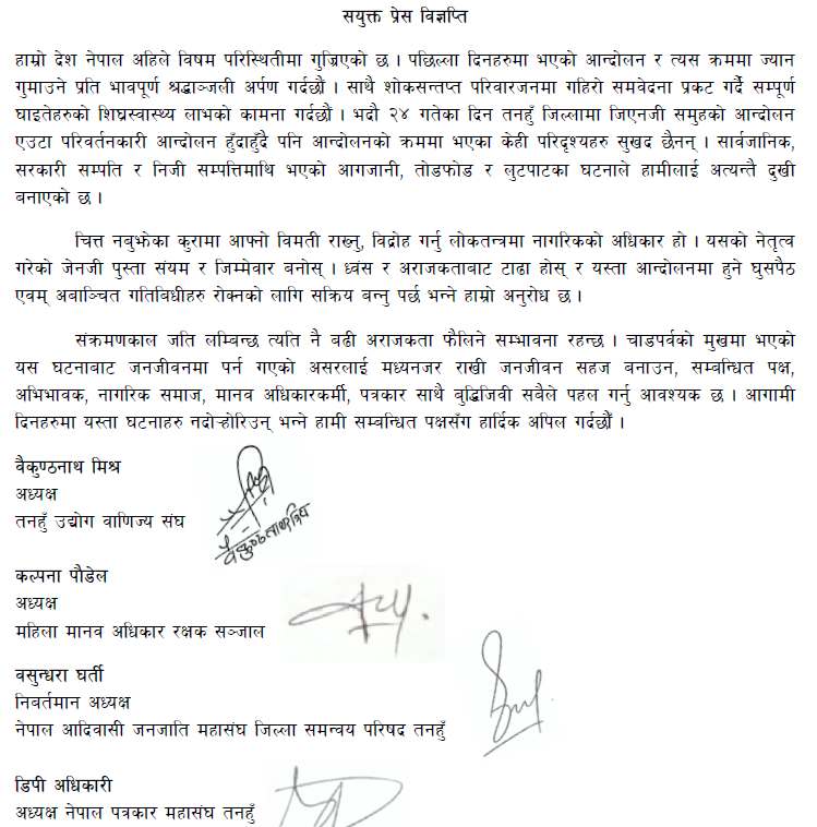 तनहुँ उद्योग वाणिज्य संघ का अध्यक्ष बैकुण्ठ नाथ मिश्र , महिला मानव अधिकार रक्षक सञ्जाल तनहुँकी अध्यक्ष कल्पना पौडेल , नेपाल आदिवासी जनजाति महासंघ तनहुँकी अध्यक्ष बसुन्धरा घर्ती र नेपाल पत्रकार महासंघ तनहुँका अध्यक्ष डिपी अधिकारीले आज जारी गरेको संयुक्त विज्ञप्तिमा आन्दोलनका क्रममा ज्यान गुमाउनेप्रति श्रद्धाञ्जली अर्पण गर्दै शोकाकुल परिवारप्रति समवेदना व्यक्त गरिएको छ। साथै, आन्दोलनको नाममा भएको हिंसा, अराजकता र लुटपाटप्रति तीव्र विरोध प्रकट गरिएको छ।