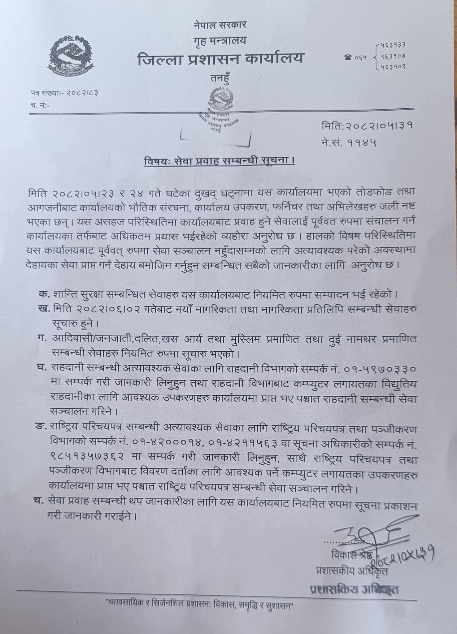 प्रहार समाचार । तनहुँ, १ असोज २०८२ बुधवार । तनहुँ जिल्ला प्रशासन कार्यालयमा मिति २०८२ भदौ २३ र २४ गते घटेका दुखद घटनाका क्रममा भएको तोडफोड र आगजनीका कारण कार्यालयका भौतिक संरचना, उपकरण, फर्निचर र महत्वपूर्ण अभिलेखहरू जली नष्ट भएका छन्। यसले कार्यालयको नियमित सेवा प्रवाहमा ठूलो प्रभाव पारेको छ।