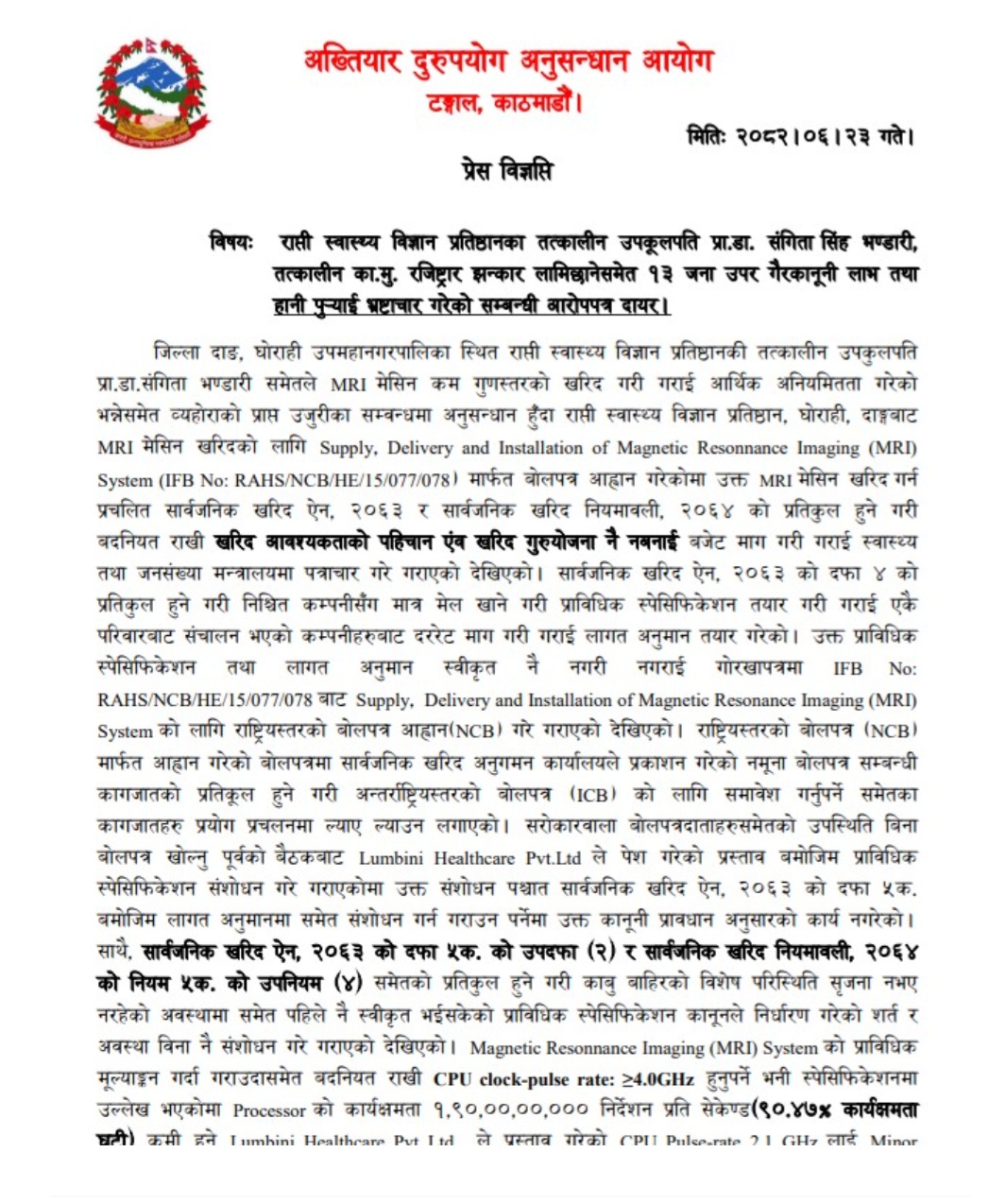 प्रहार समाचार । काठमाडौँ , २४ असोज २०८२ शुक्रवार । राजनीतिक पहुँचका आडमा स्वास्थ्य उपकरण खरिदमा अनियमितता, कानुनविपरीत प्रक्रिया र गुणस्तरहीन मेसिन स्वीकृतिको आरोपसहित राप्ती स्वास्थ्य विज्ञान प्रतिष्ठानका पूर्व उपकुलपति प्राडा संगीता सिंह भण्डारीसहित १३ जनाविरुद्ध अख्तियारले विशेष अदालतमा भ्रष्टाचार मुद्दा दायर गरेको छ।