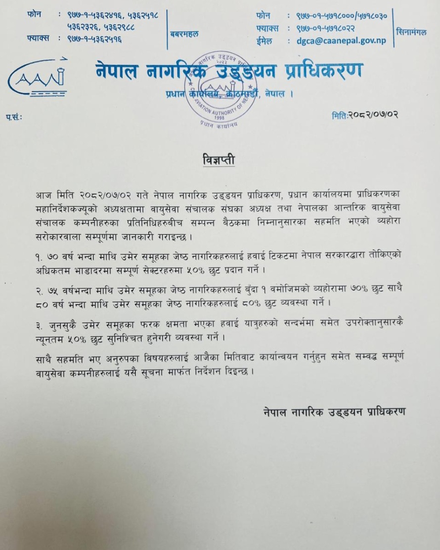 प्रहार समाचार । काठमाडौँ, ३ कात्तिक २०८२ सोमवार । नेपाल नागरिक उड्डयन प्राधिकरणले ज्येष्ठ नागरिक र फरक क्षमता भएका यात्रुहरूका लागि हवाई भाडामा उल्लेखनीय छुट दिने निर्णय गरेको छ। हवाई यात्रालाई समावेशी र पहुँचयोग्य बनाउने उद्देश्यले प्राधिकरणले उक्त निर्णय गरेको हो । प्राधिकरणका महानिर्देशक प्रदीप अधिकारीको अध्यक्षतामा संघका अध्यक्ष मनोज कार्की र सदस्य वायुसेवाका प्रतिनधिबीच भएको बैठकले यस्तो सहमति गरेको हो ।