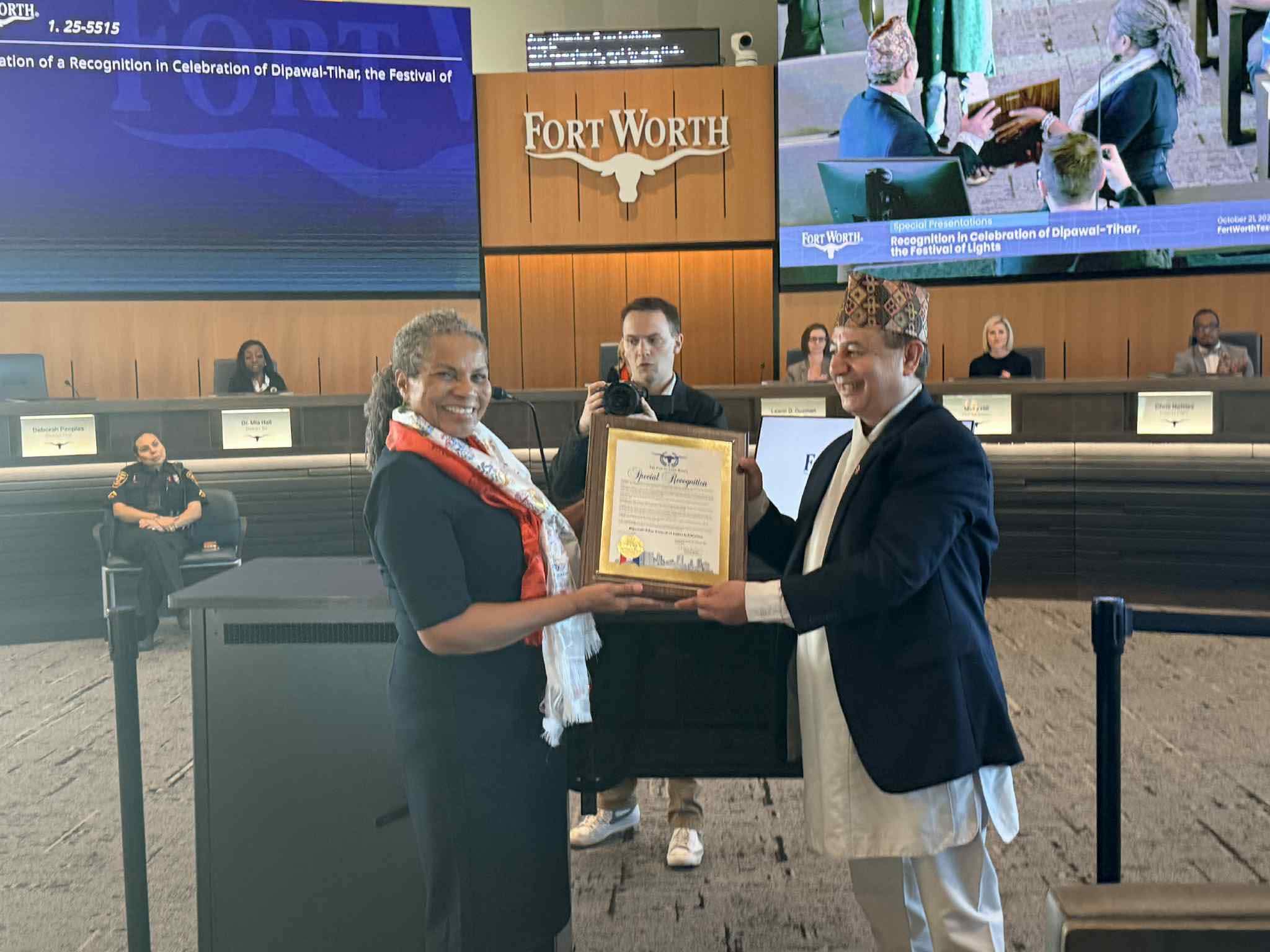 प्रहार समाचार । अमेरिका , ६ कात्तिक २०८२ बिहीवार । अमेरिकाको टेक्सस राज्यस्थित फोर्ट वर्थ सिटीले नेपालीहरूको दोस्रो ठूलो पर्व दीपावलीलाई आधिकारिक सांस्कृतिक उत्सवका रूपमा मान्यता दिएको छ। सिटी काउन्सिलको निर्णय अनुसार अबदेखि प्रत्येक वर्ष दीपावली फोर्ट वर्थको वार्षिक सांस्कृतिक पर्वको रूपमा मनाइनेछ।
