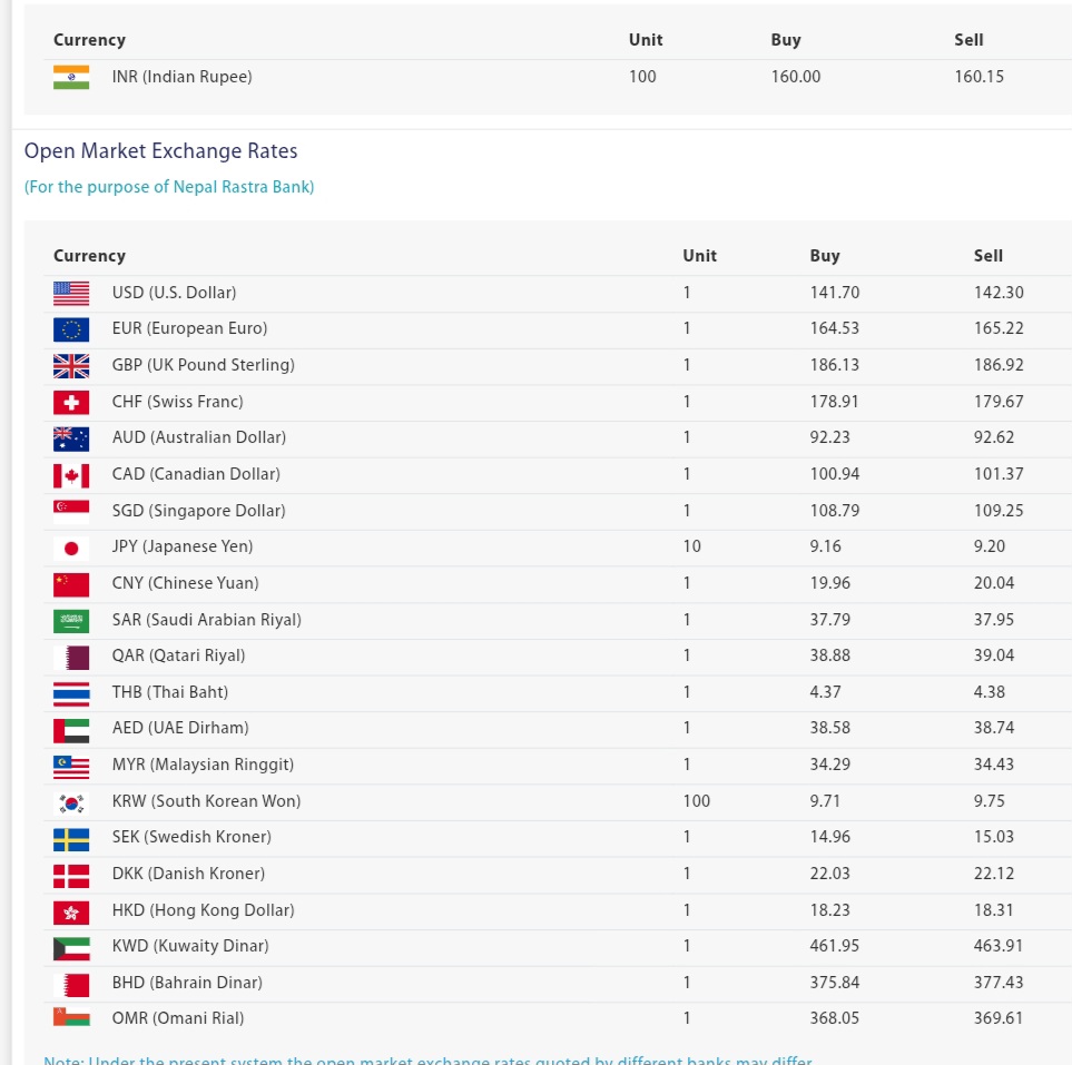 आइतवार । नेपाल राष्ट्र बैंकले आजको लागि विदेशी मुद्राको विनिमय दर निर्धारण गरेको छ। जस अनुसार विनिमय दर यसप्रकार रहेको छ।