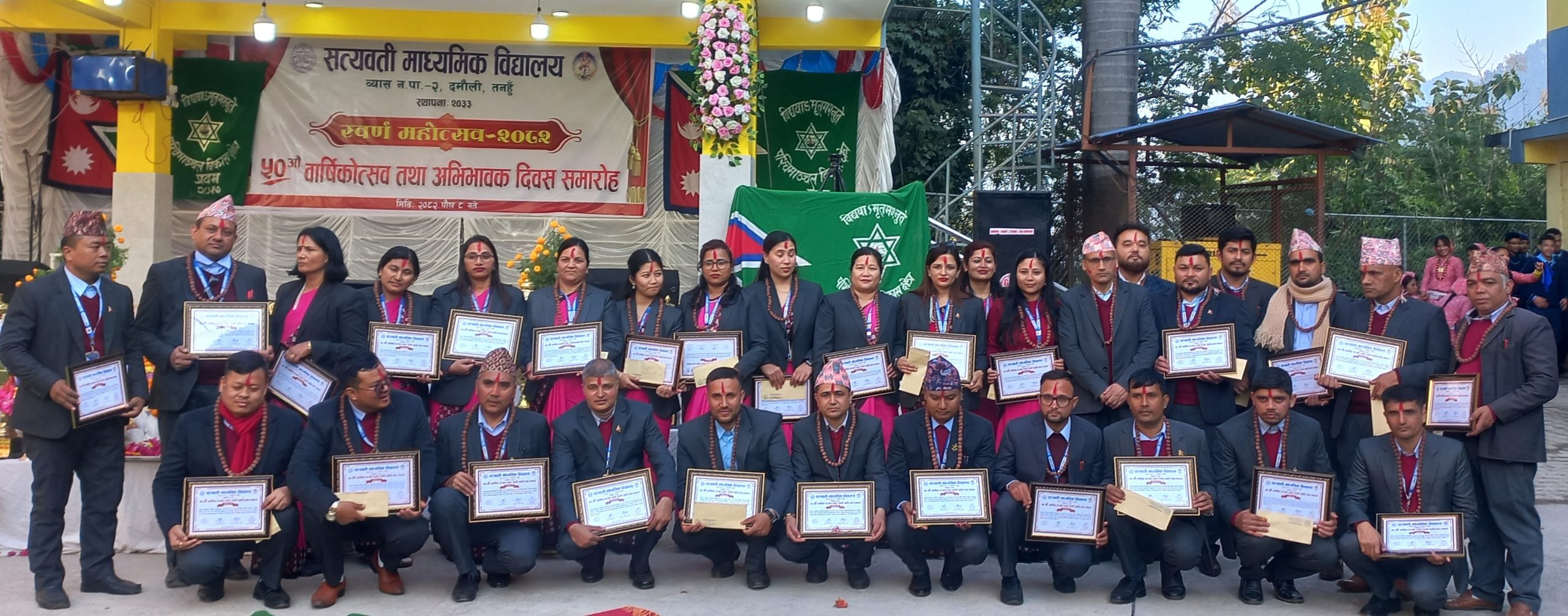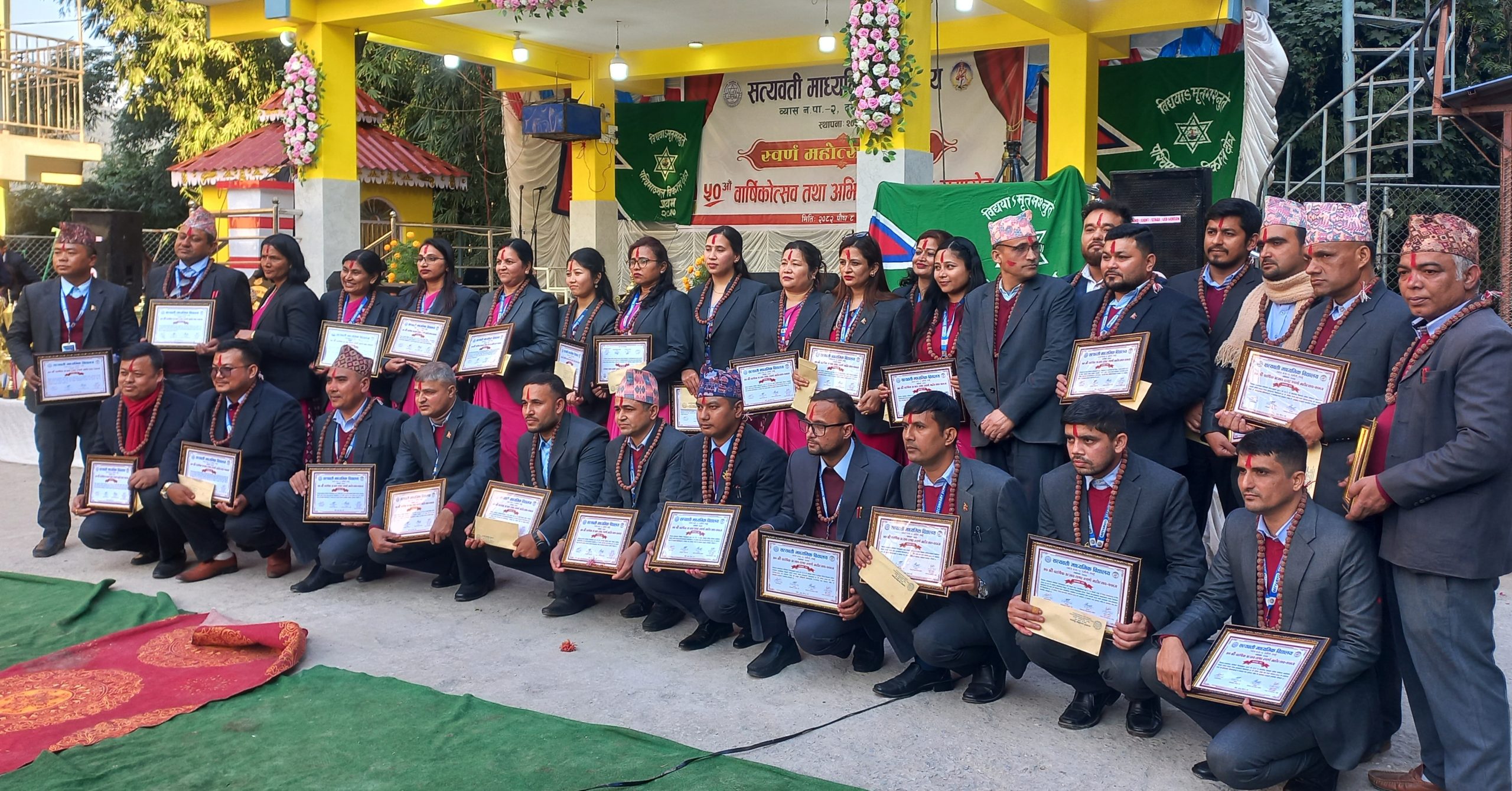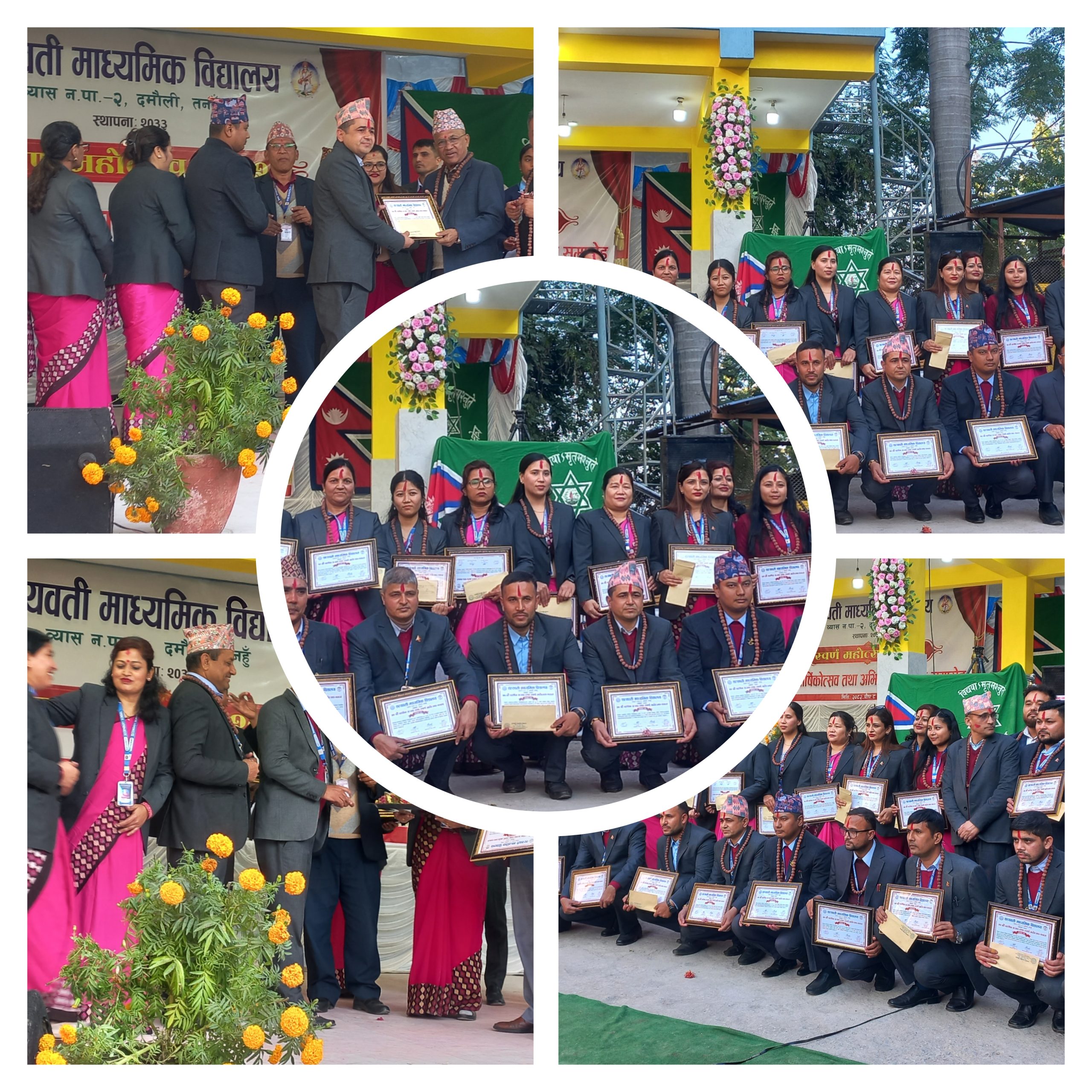 विद्यालयको स्वर्ण जयन्तिका अबसरमा विद्यालयमा आयोजिक स्वर्ण जयन्ति समारोहमा शैक्षिक गुणस्तर अभिवृद्धिमा योगदान पुर्याउने शिक्षकहरूलाई सम्मान गरिएको हो ।