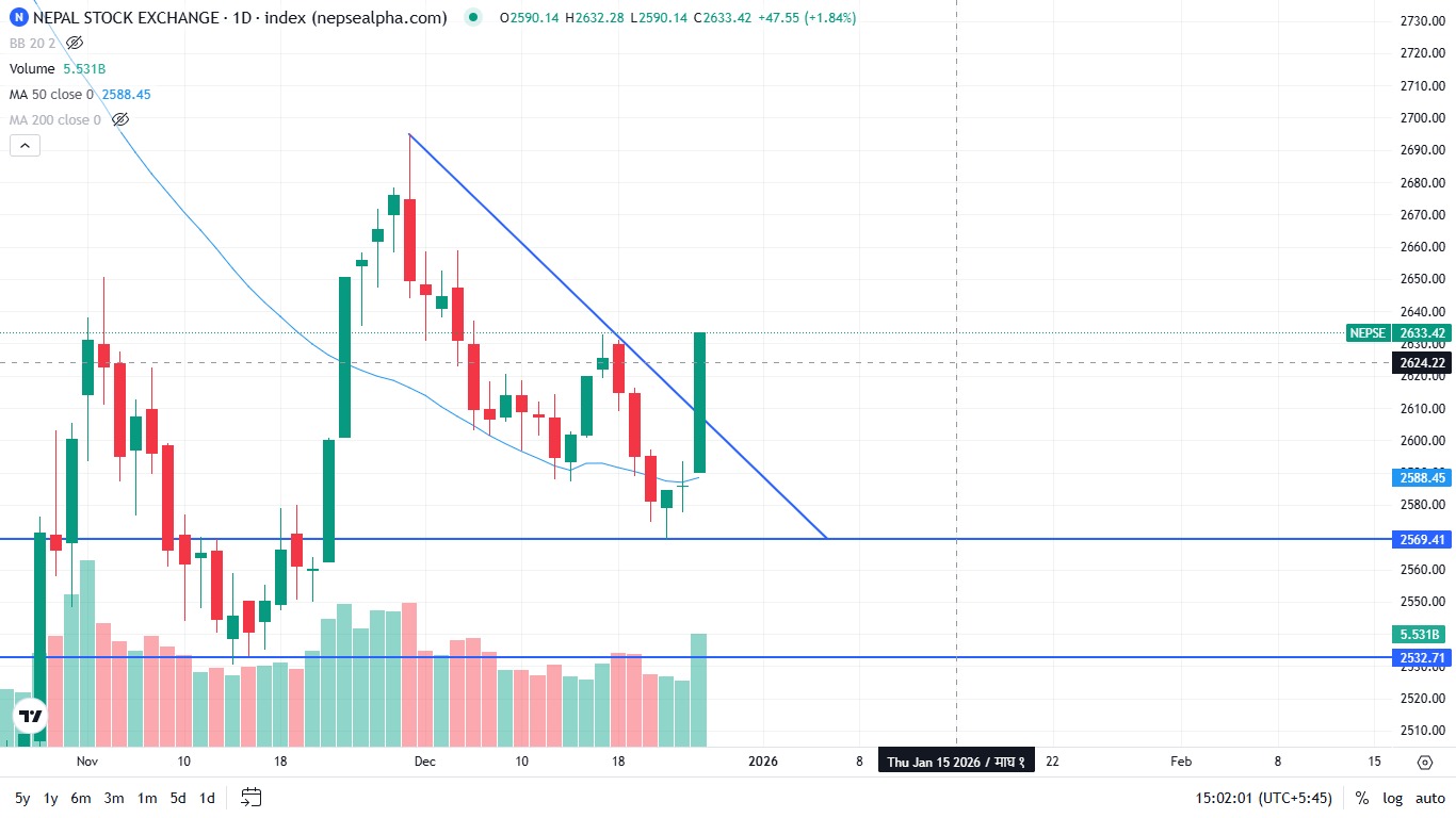 नेप्से सूचक आज ठूलो हरियो मारुबोजु क्यान्डल बनाउँदै बन्द भयो। लामो समयदेखि कमजोर कारोबार र निरन्तर करेक्सनले थकित बनेका लगानीकर्ताहरू पुनः सक्रिय देखिए। विशेषगरी बैंकिङ, विकास बैंक र हाइड्रोपावर समूहमा खरिद चासो बढेको बजार स्रोतको भनाइ छ।