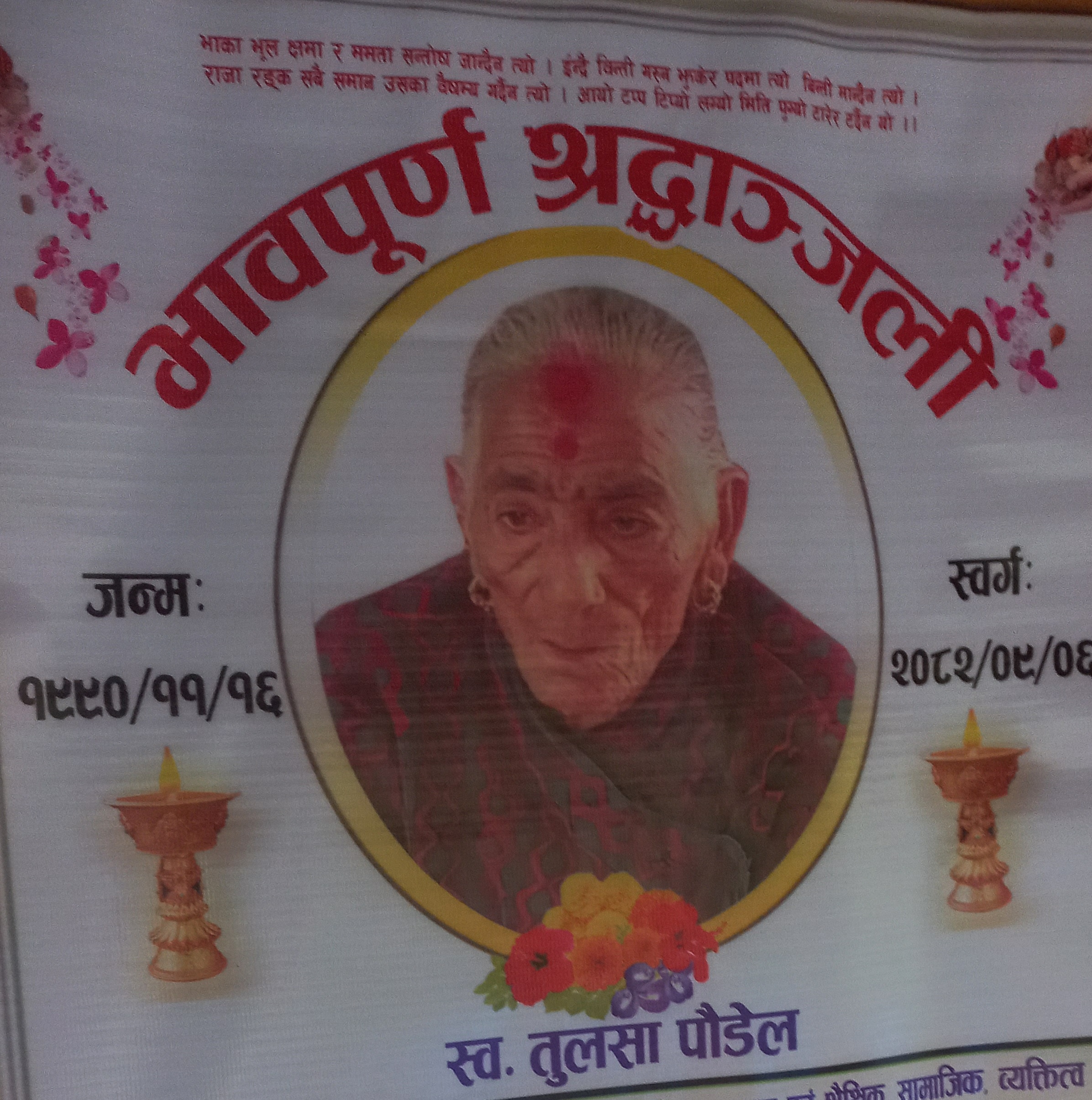 प्रहार समाचार । तनहुँ, १३ पुस २०८२ आइतबार । खानेपानी तथा सरसफाई डिभिजन कार्यालय तनहुँका पूर्व डिभिजन प्रमुख हरिदत्त पौडेल तथा शैक्षिक एवं सामाजिक व्यक्तित्व नारायणदत्त पौडेलकी आमा तुलसा पौडेलको ९२ वर्षको उमेरमा भएको निधनप्रति व्यास नगरपालिका–९ डोटेलफाँटमा श्रद्धाञ्जली तथा समवेदना व्यक्त गरिएको छ।