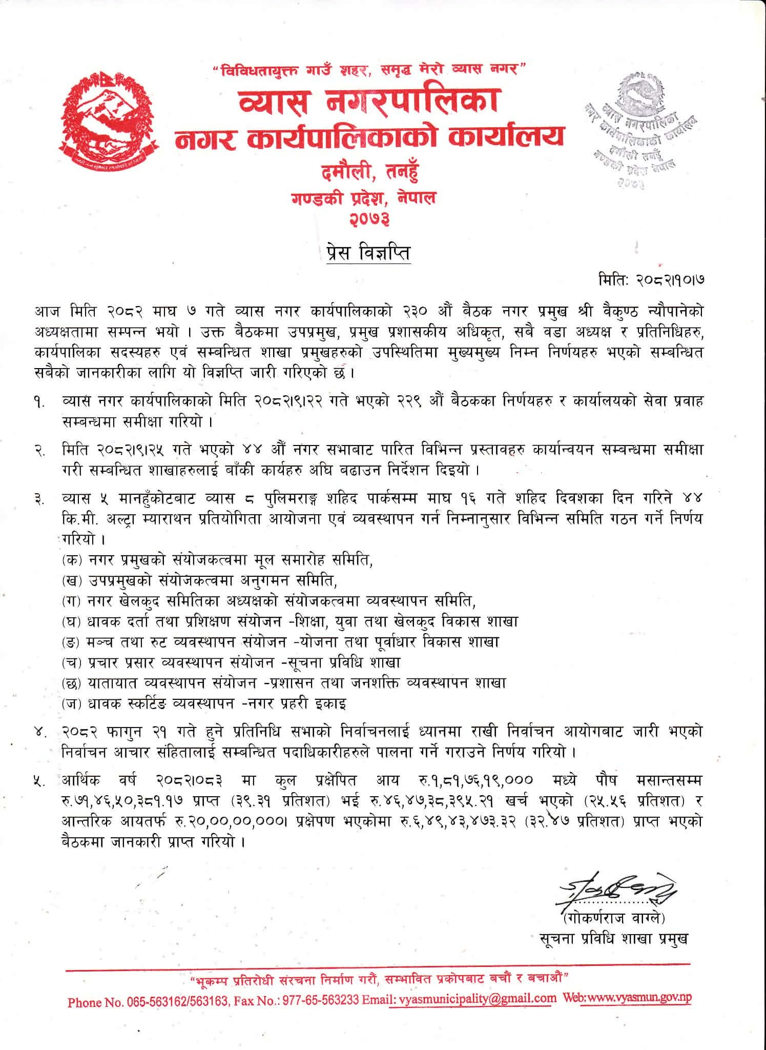 व्यास नगरपालिकाको २३० औं बैठकले खेलकुद, पर्यटन, सुशासन र निर्वाचन व्यवस्थापनलाई एकसाथ अघि बढाउने दिशामा ठोस निर्णय गरेको निष्कर्ष निकालिएको छ।
