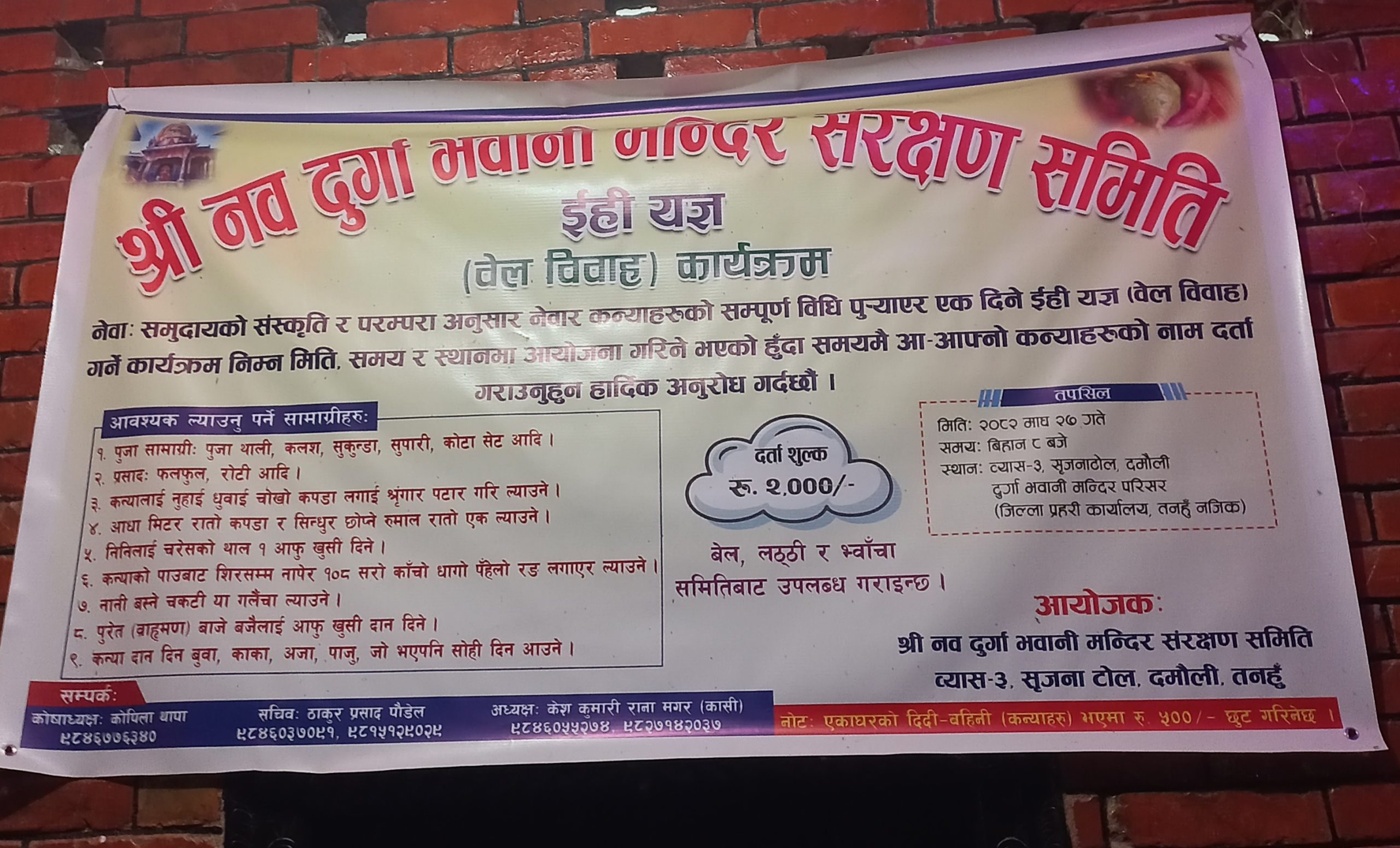 प्रहार समाचार । तनहुँ, २३ माघ २०८२ शुक्रबार । नेवाः समुदायको मौलिक संस्कृति र परम्परालाई जगेर्ना गर्ने उद्देश्यसहित तनहुँको दमौलीमा ईही (वेल विवाह) यज्ञ आयोजना हुने भएको छ। नव दुर्गा भवानी मन्दिर संरक्षण समिति व्यास–३, सृजना टोल दमौलीको आयोजनामा माघ २७ गते दुर्गा भवानी मन्दिर परिसरमा उक्त कार्यक्रम हुन लागेको हो। नेवार कन्याहरूको धार्मिक विधि र संस्कारलाई सामूहिक रूपमा सम्पन्न गराउने लक्ष्यसहित कार्यक्रम आयोजना गरिएको आयोजक समितिले जनाएको छ।