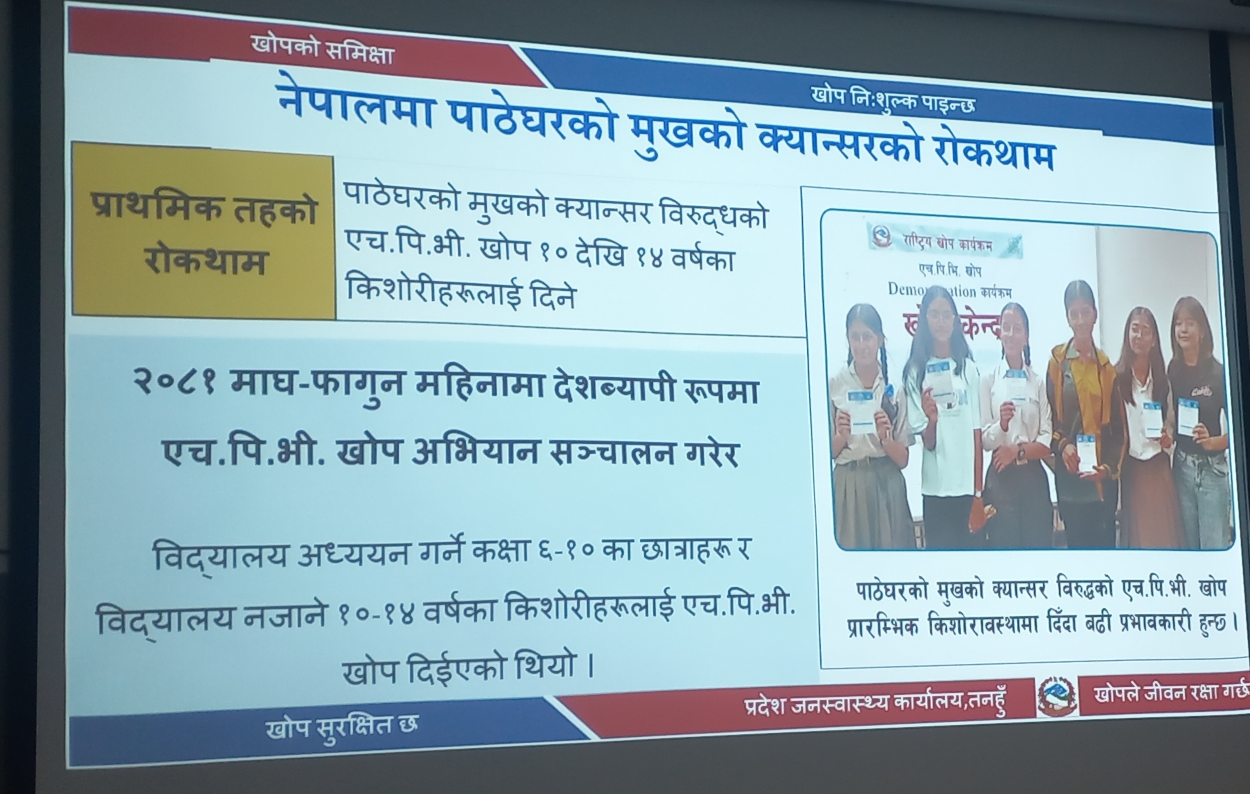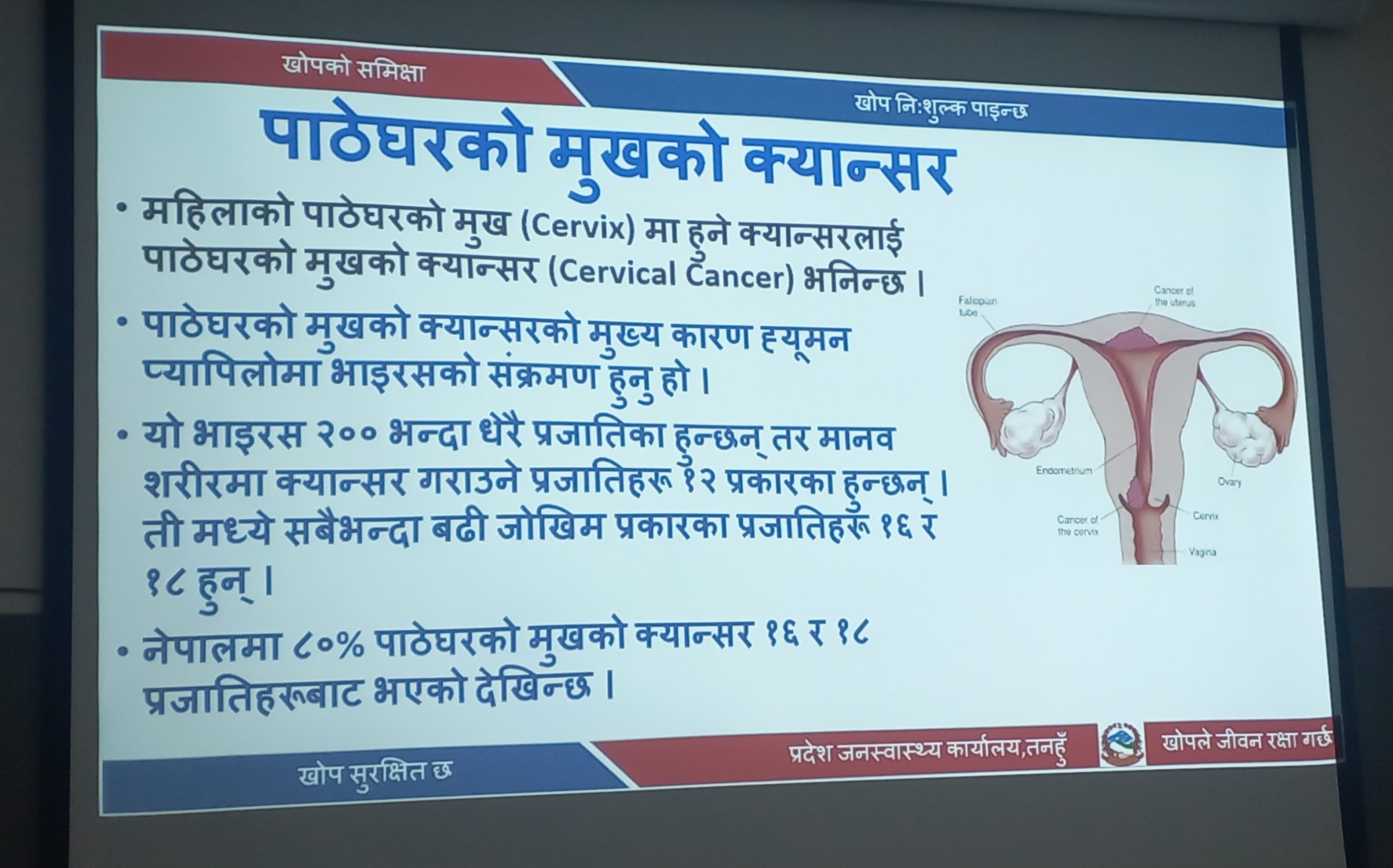 कार्यालय प्रमुख दवाडीका अनुसार खोप अभियानसँगै पाठेघरको मुखको क्यान्सर र यसको रोकथामका उपायबारे अभिमुखीकरण कार्यक्रम पनि सञ्चालन गरिएको छ । विश्व स्वास्थ्य संगठनका तथ्यांकअनुसार हरेक वर्ष विश्वभर ५ लाख ७० हजार महिलामा पाठेघरको मुखको क्यान्सर देखिन्छ भने ३ लाख ११ हजारको मृत्यु हुने गरेको छ । सन् २०३० सम्म यो संख्या अझै बढ्ने अनुमान गरिएको छ ।