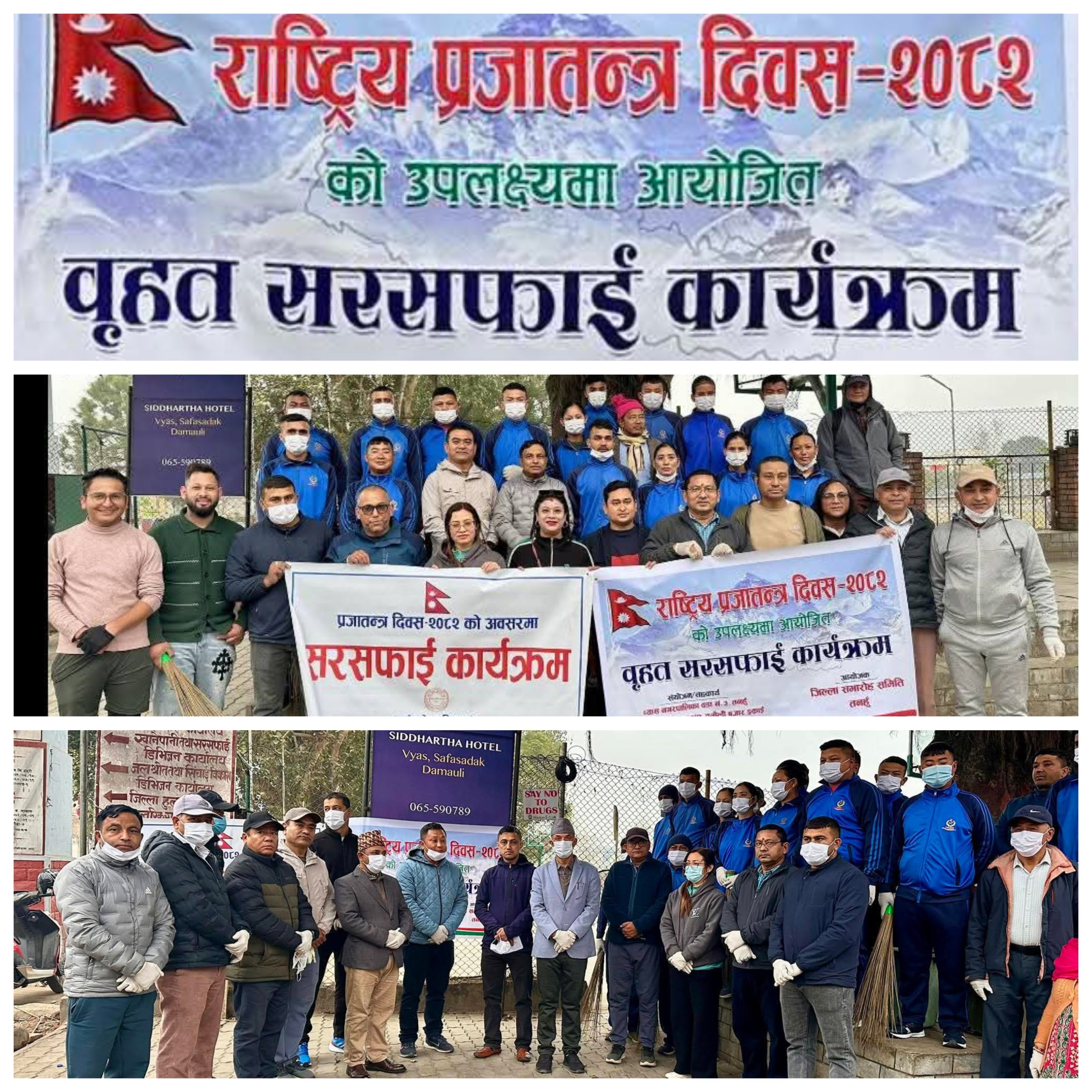 प्रहार समाचार । तनहुँ, ६ फागुन २०८२ बुधबार । प्रजातन्त्र दिवस–२०८२ को अवसरमा दमौलीमा नागरिकहरूको सक्रिय सहभागितामा वृहत सरसफाइ कार्यक्रम सम्पन्न भएको छ। जिल्ला समारोह समिति तनहुँको आयोजनामा गरिएको कार्यक्रममा बिहानैदेखि दमौली बजार क्षेत्र केन्द्रित सरसफाइ अभियानमा स्थानीय बासिन्दा, व्यवसायी र स्वयंसेवकहरू सडकमा उत्रिएका थिए।