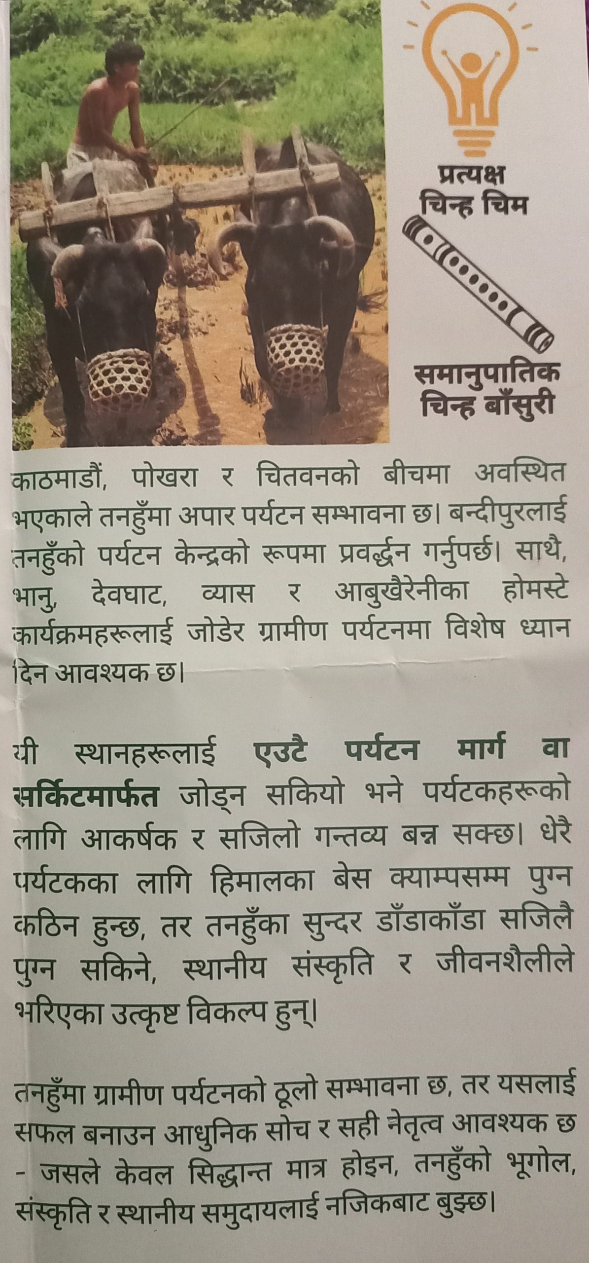 प्रहार समाचार । तनहुँ, ९ फागुन २०८२ शनिबार । आसन्न प्रतिनिधि सभा निर्वाचनका लागि तनहुँ–१ बाट उम्मेदवारी दिएका मन्जिल रानाले जीवन भोगाइबाट जन्मिएको घोषणापत्र सार्वजनिक गरेका छन्। ‘तनहुँको पीडा किताबमा होइन, आफ्नै आँखाले देखेको छु’ भन्ने मूल सन्देशसहित सार्वजनिक घोषणापत्रमा उनले किसान, उपभोक्ता, शिक्षा, रोजगारी र पर्यटनलाई एउटै शृङ्खलामा जोडेर आफ्नो दृष्टिकोण अघि सारेका छन्।