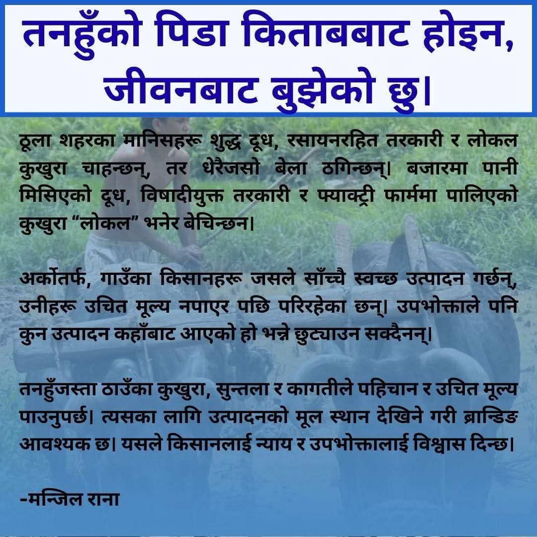 रानाले सहरका उपभोक्ता र गाउँका किसान दुवै ठगिइरहेको यथार्थ औंल्याएका छन्। “ठूला सहरमा शुद्ध भैंसीको दूध, विषादीरहित तरकारी र लोकल कुखुरा खोज्ने उपभोक्ता अधिकांश समय ठगिन्छन्। अर्कोतर्फ, गाउँमा साँचो उत्पादन गर्ने किसानले उचित मूल्य पाउँदैनन्,” उनले भने। यसको समाधानका रूपमा उनले तनहुँका कुखुरा, सुन्तला र कागतीजस्ता उत्पादनलाई मूल स्थान खुल्ने गरी ब्रान्डिङ गर्नुपर्ने आवश्यकता औंल्याएका छन्। यसले किसानलाई न्याय र उपभोक्तालाई विश्वास दिने उनको दाबी छ।