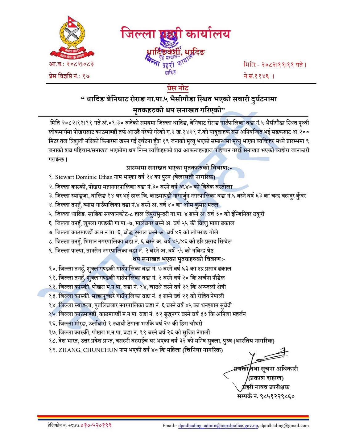 मृतकमध्ये बेलायती नागरिक स्टेवार्ट डोमिनिक इथन (२४), भारतीय नागरिक मनिष सुक्ला (३२) र चिनियाँ नागरिक झाङ चुनचुन (४०) समेत रहेका छन्। जिल्ला प्रहरी कार्यालय धादिङका प्रवक्ता प्रहरी नायव उपरीक्षक प्रकाश दाहालले सबै मृतकको पहिचान भइसकेको जानकारी दिँदै दुर्घटनाको कारणबारे थप अनुसन्धान जारी रहेको बताए।
