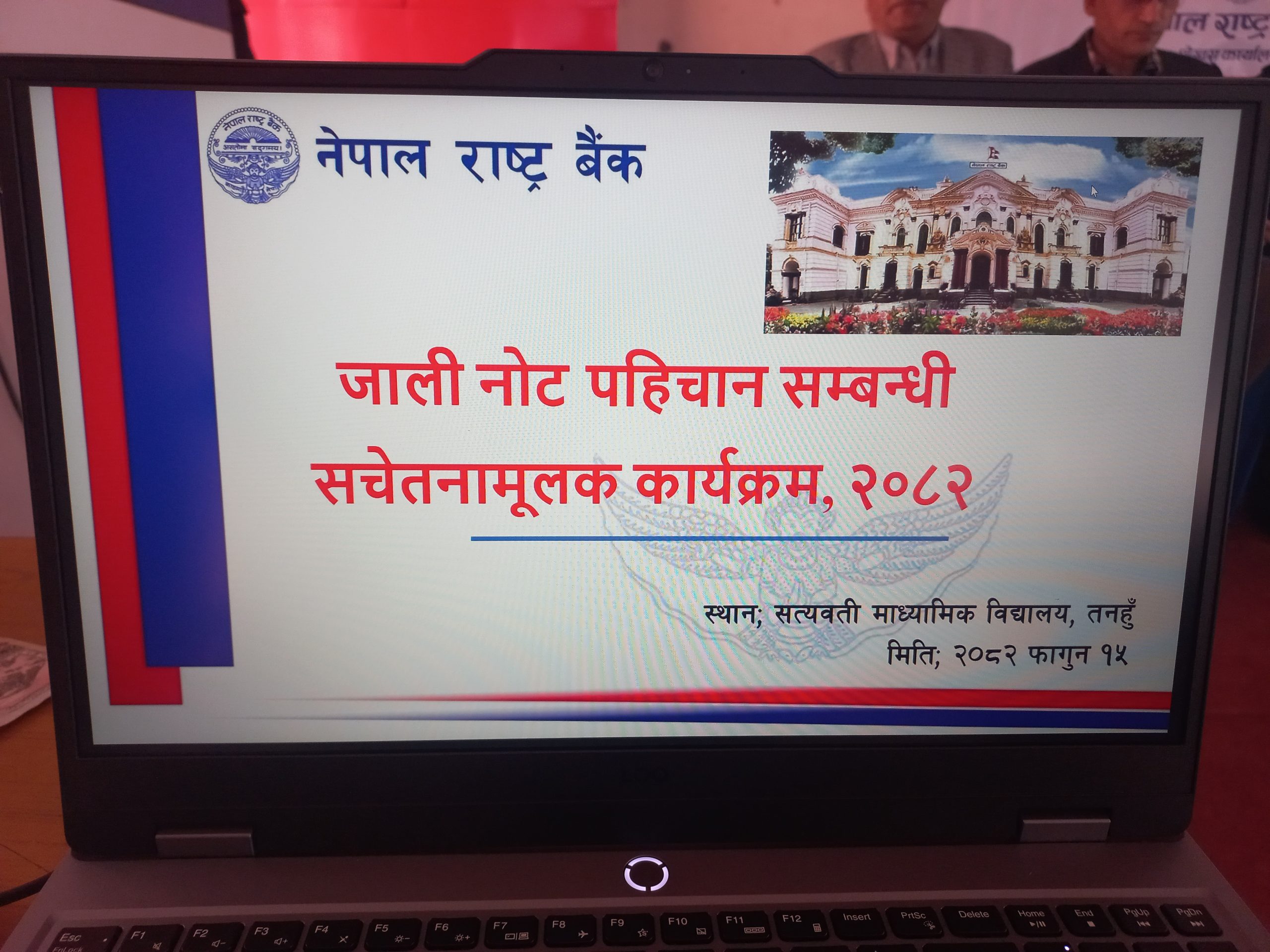 प्रहार समाचार । तनहुँ, १५ फागुन २०८२ शुक्रबार । आसन्न प्रतिनिधि सभा निर्वाचनलाई केन्द्रमा राख्दै नेपाल राष्ट्र बैंक पोखरा कार्यालयले जाली नोट पहिचान सम्बन्धी सचेतनामूलक कार्यक्रम सञ्चालन गरेको छ। निर्वाचन नजिकिँदै जाँदा नगद कारोबार बढ्ने र त्यसको आडमा जाली नोट प्रयोग हुने सम्भावना उच्च रहने भन्दै आम नागरिकलाई सचेत गराउने उद्देश्यले कार्यक्रम आयोजना गरिएको हो।