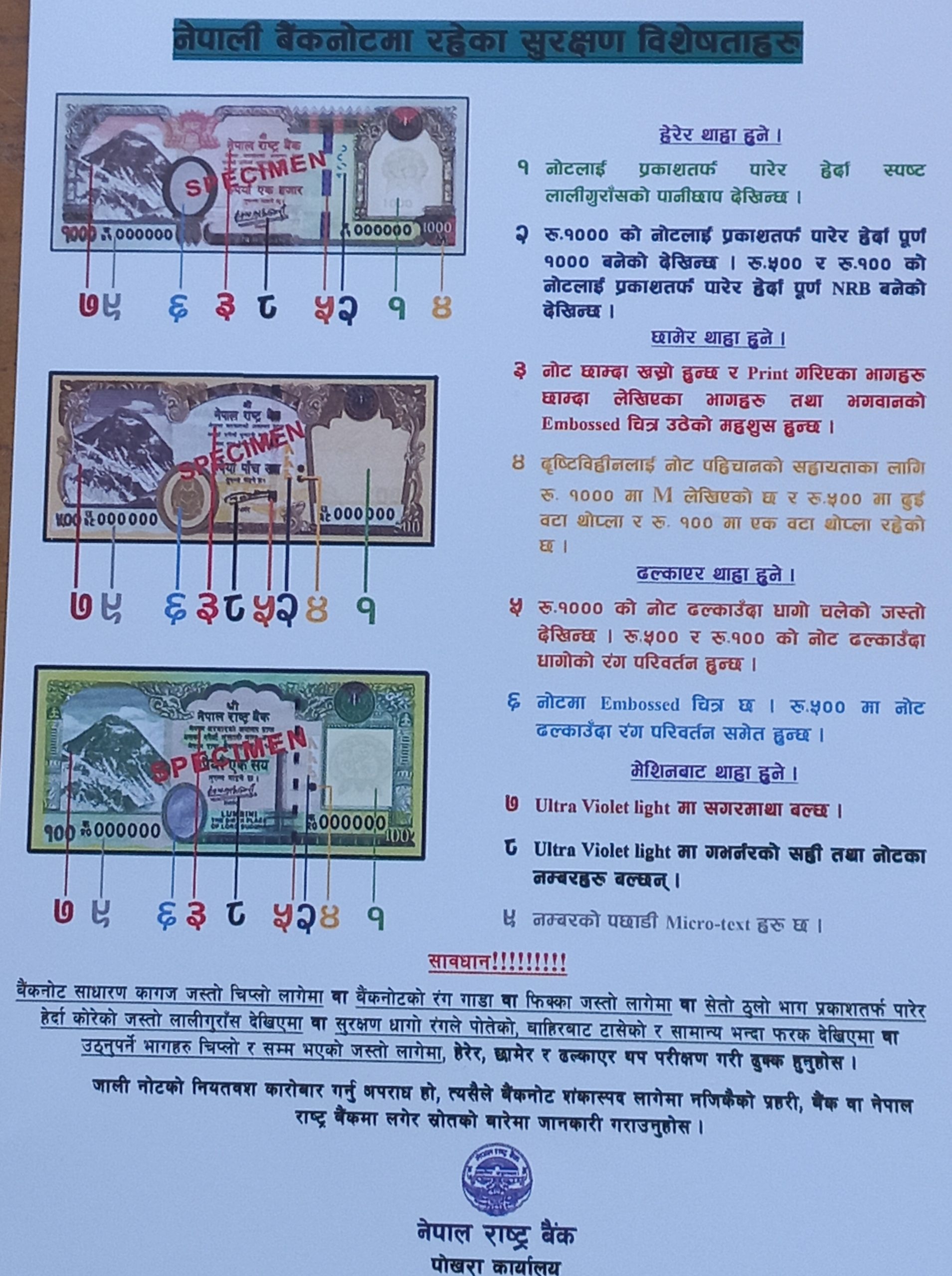 कार्यक्रममा पोखरा कार्यालयका निर्देशक केशव प्रसाद तिमल्सिनाले वर्षेनी सय, पाँच सय र हजार दरका जाली नोटहरू फेला पर्ने गरेको जानकारी दिए। उनले जाली नोट भेटिएमा प्रयोग नगर्नु नै सबैभन्दा सुरक्षित उपाय भएको उल्लेख गर्दै नजिकको बैंक वा प्रहरी कार्यालयमा बुझाउन सबैलाई अनुरोध गरे। निर्वाचन जस्तो संवेदनशील समयमा जाली नोटको प्रयोगले आर्थिक अपराध बढ्नुका साथै सामाजिक अविश्वाससमेत सिर्जना गर्न सक्ने भएकाले नागरिक स्वयं सजग हुनुपर्ने उनको भनाइ थियो।