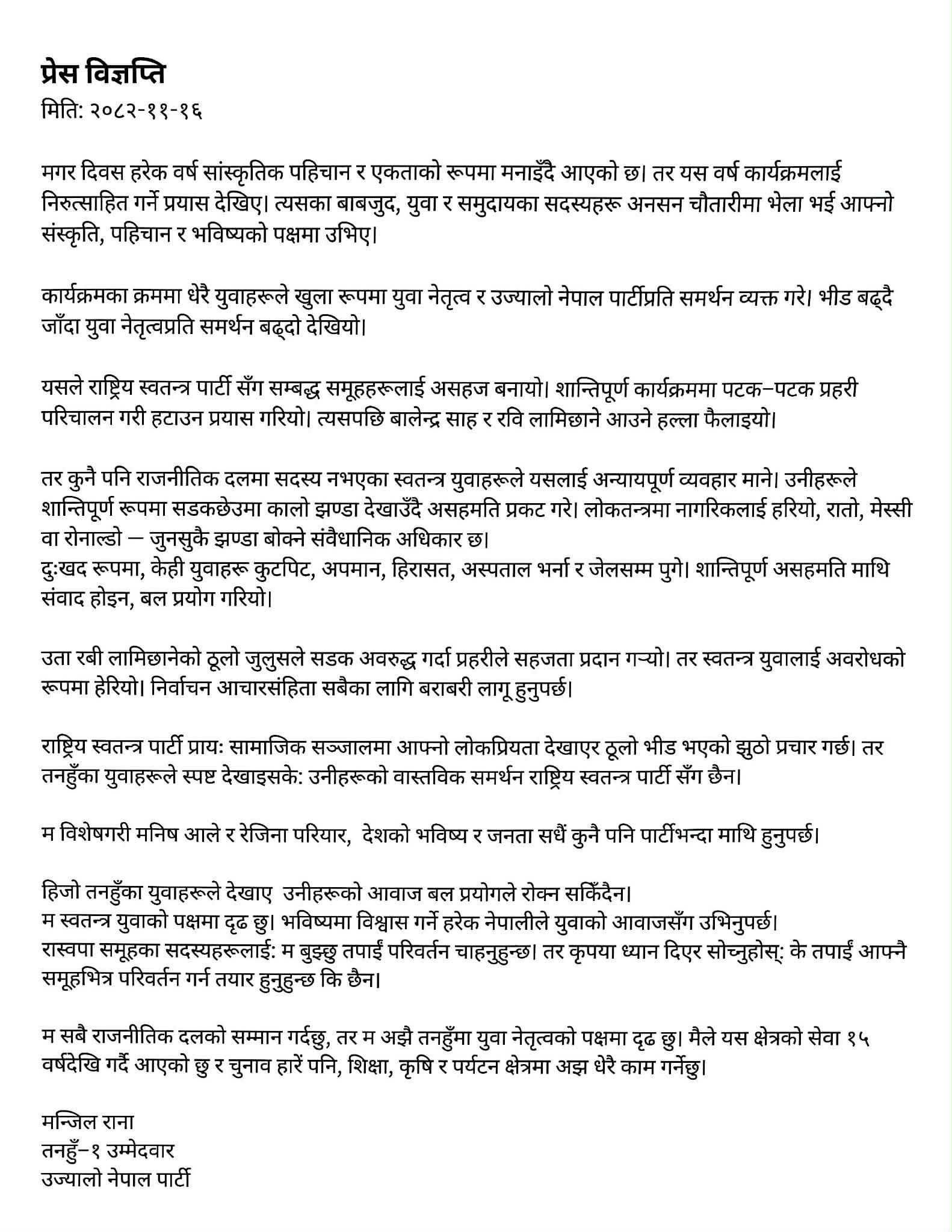 प्रहरीको बल प्रयोगका क्रममा उज्यालो नेपाल पार्टी तनहुँका नेता शुभम श्रेष्ठ गम्भीर घाइते भई अस्पताल भर्ना गरिएको विज्ञप्तिमा उल्लेख छ। साथै, केही अन्य युवाहरू कुटपिट, अपमान, हिरासत र जेलसम्म पुग्नुपरेको दाबी गरिएको छ। शान्तिपूर्ण कार्यक्रममा संवादको सट्टा लाठीचार्ज र बल प्रयोग गरिएको भन्दै आक्रोश व्यक्त गरिएको छ। उता, राष्ट्रिय स्वतन्त्र पार्टी सँग सम्बद्ध ठूलो जुलुसले सडक अवरुद्ध गर्दा भने प्रहरीले सहजता दिएको आरोप लगाउँदै दोहोरो मापदण्ड अपनाइएको प्रश्न उठाइएको छ। निर्वाचन आचारसंहिता सबैका लागि समान रूपमा लागू हुनुपर्ने माग गरिएको छ। हेरौं प्रेस विज्ञप्ति :