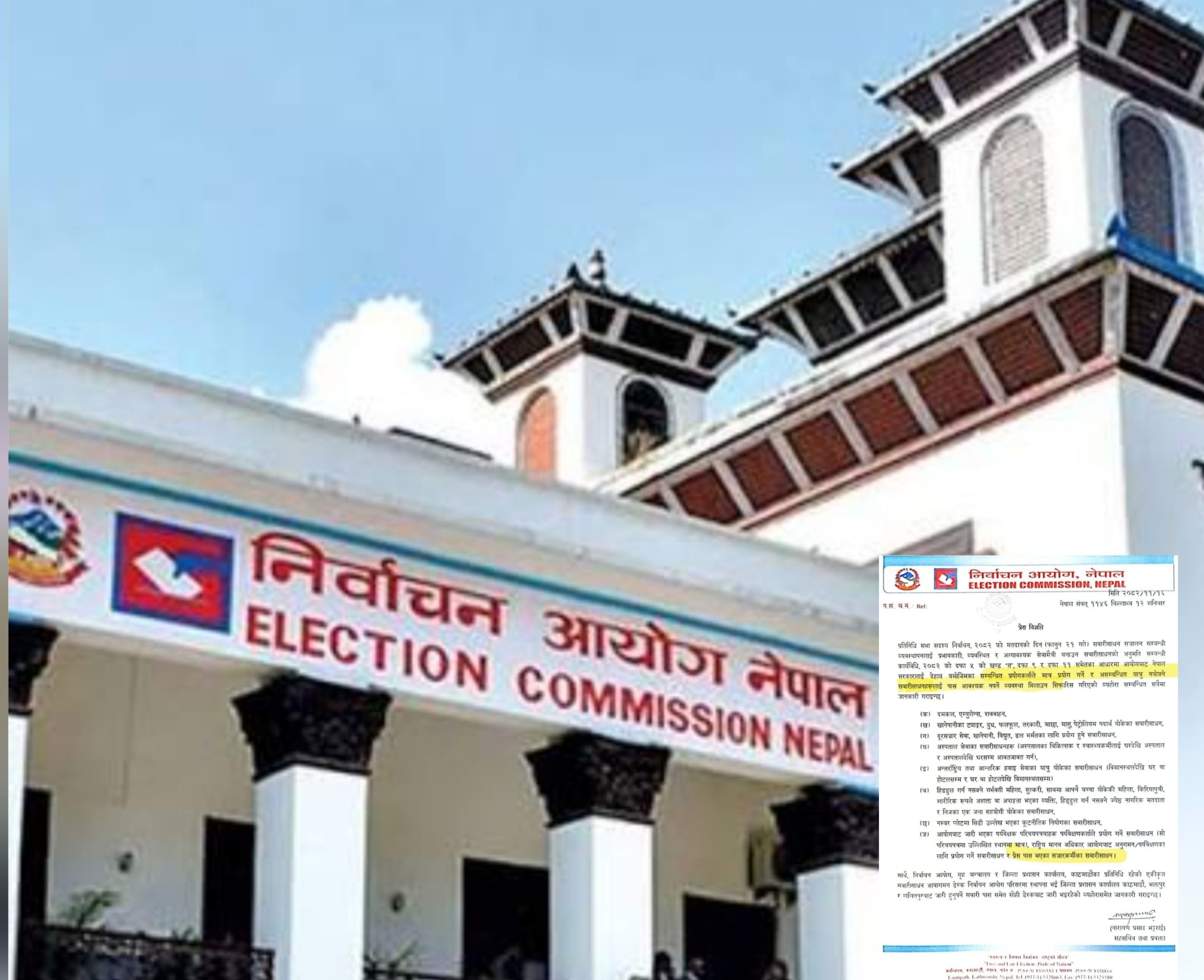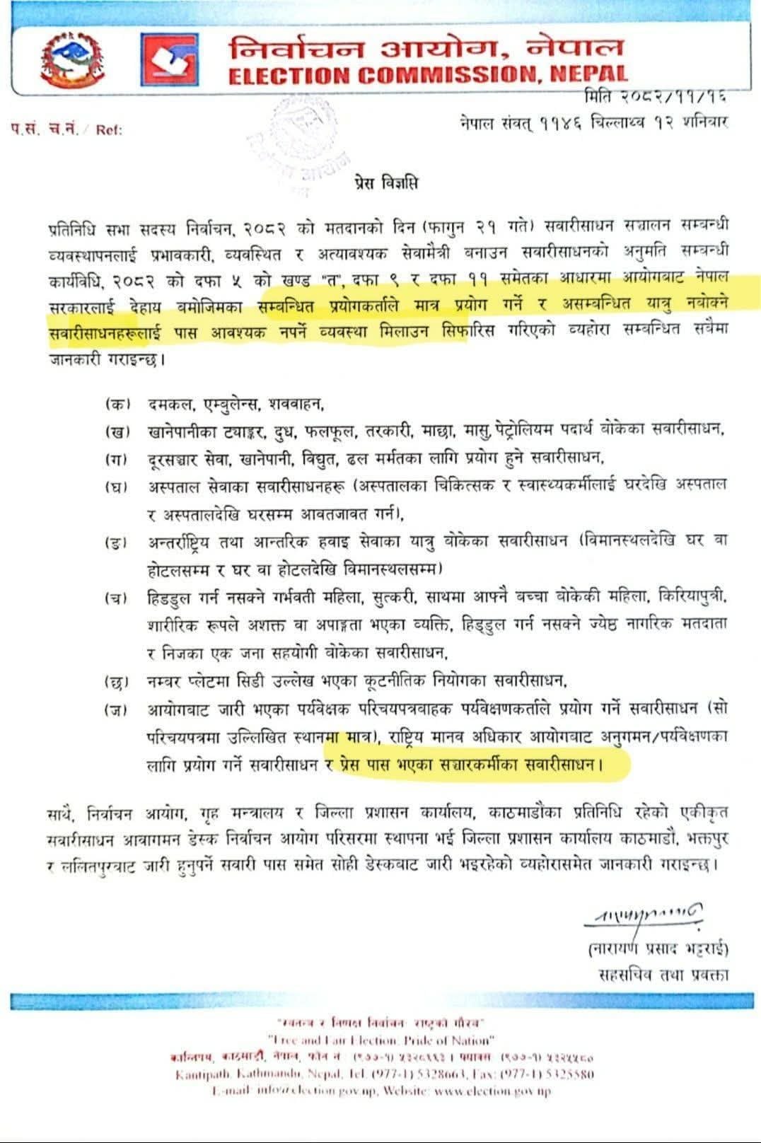 निर्वाचन आयोग, नेपालले सवारीसाधनको अनुमति सम्बन्धी कार्यविधि, २०८२ अनुसार दमकल, एम्बुलेन्स, शववाहन, खानेपानीका ट्याङ्कर, दुध, फलफूल, तरकारी, माछा, मासु तथा पेट्रोलियम पदार्थ बोकेका सवारीलाई छुट दिने सिफारिस गरेको हो। यस्तै दूरसञ्चार, विद्युत, खानेपानी र ढल मर्मतका सवारी तथा अस्पतालका चिकित्सक र स्वास्थ्यकर्मी आवतजावतका सवारीसमेत निर्बाध चल्न पाउनेछन्।
