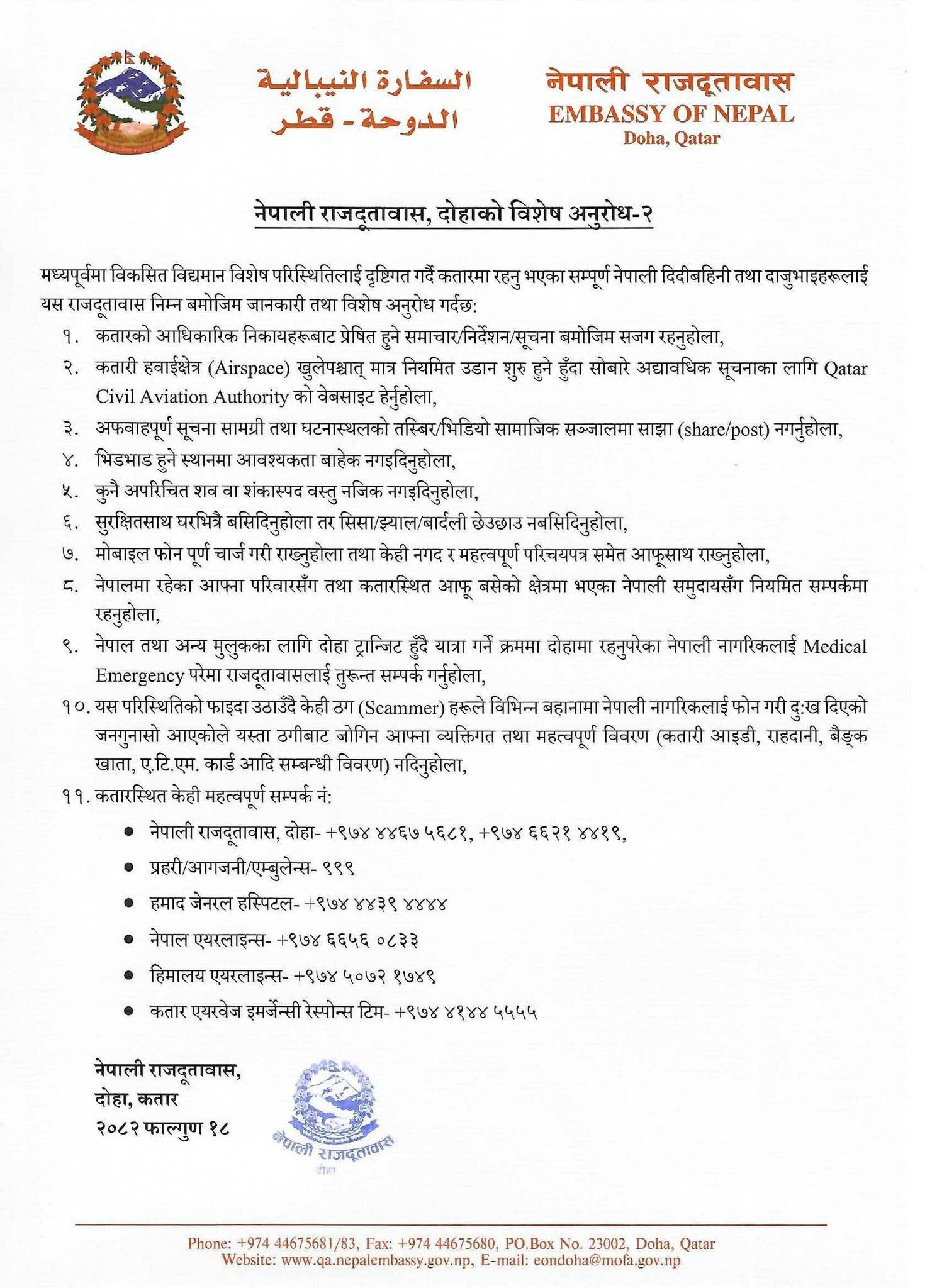 यसैबीच, पछिल्लो समय ठगी गर्ने समूहले फोनमार्फत व्यक्तिगत विवरण मागेर दुःख दिने गुनासो आएको भन्दै दूतावासले कतारी आइडी, राहदानी, बैंक खाता वा एटीएम कार्डसम्बन्धी विवरण कसैलाई नदिन चेतावनी दिएको छ। आपतकालीन अवस्थामा प्रहरी, आगजनी वा एम्बुलेन्सका लागि ९९९ नम्बरमा सम्पर्क गर्न सकिने तथा आवश्यक परे दूतावास, अस्पताल र एयरलाइन्सका सम्पर्क नम्बर प्रयोग गर्न पनि आग्रह गरिएको छ।
