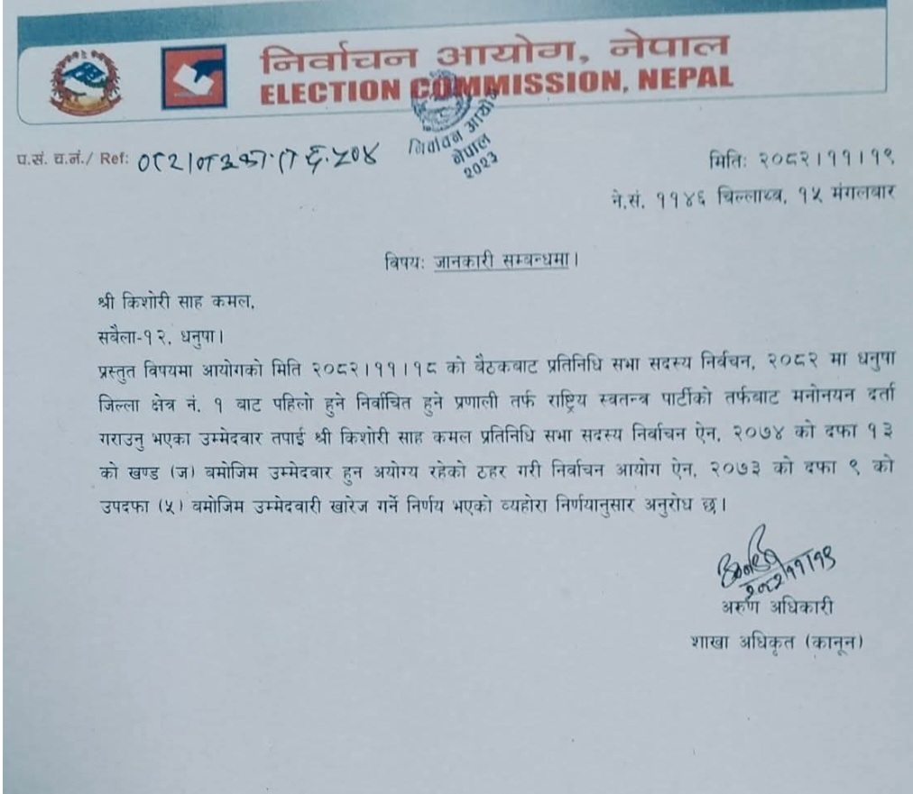 निर्वाचन आयोगका कार्यवाहक प्रमुख रामप्रसाद भण्डारीका अनुसार बैंक तथा वित्तीय संस्थाको कालोसूचीमा नाम रहेको आधिकारिक प्रमाण पेश भएपछि साहको उम्मेदवारी रद्द गरिएको हो। निर्वाचनसम्बन्धी कानुनी प्रावधानअनुसार कालोसूचीमा रहेका व्यक्तिको उम्मेदवारी कायम राख्न नमिल्ने व्यवस्था छ।