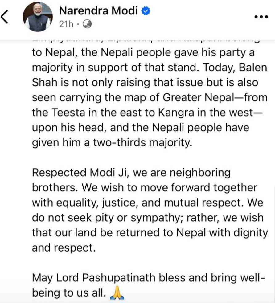 प्रहार समाचार । काठमाडौं, २६ फागुन २०८२ मंगलबार । आम निर्वाचनपछि भारतीय प्रधानमन्त्री नरेन्द्र मोदीले दिएको बधाई सन्देशप्रति राष्ट्रिय स्वतन्त्र पार्टी (रास्वपा) का वरिष्ठ नेता तथा भावी प्रधानमन्त्रीका रूपमा हेरिएका संसद बलेन्द्र शाह (बालेन)ले सामाजिक सञ्जालमार्फत जवाफ दिएका छन्। मोदीले अंग्रेजी भाषामा शुभकामना व्यक्त गरेपछि बालेनले नेपाली भाषामै धन्यवाद व्यक्त गर्दै प्रतिक्रिया दिएका हुन् ।
