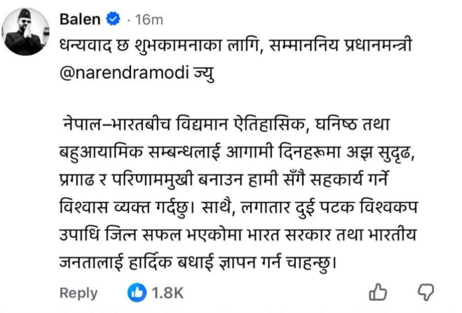 यसअघि मोदीले सामाजिक सञ्जाल फेसबुक र एक्समार्फत रास्वपा सभापति Rabi Lamichhane र बालेनलाई फोन गरेर आम निर्वाचनमा विजय हासिल गरेकोमा बधाई दिएको जानकारी दिएका थिए। रवि लामिछानेले हिजो राति नै एक्समार्फत जवाफ दिएका थिए भने बालेनले आज फेसबुकमार्फत प्रतिक्रिया दिएका हुन्।